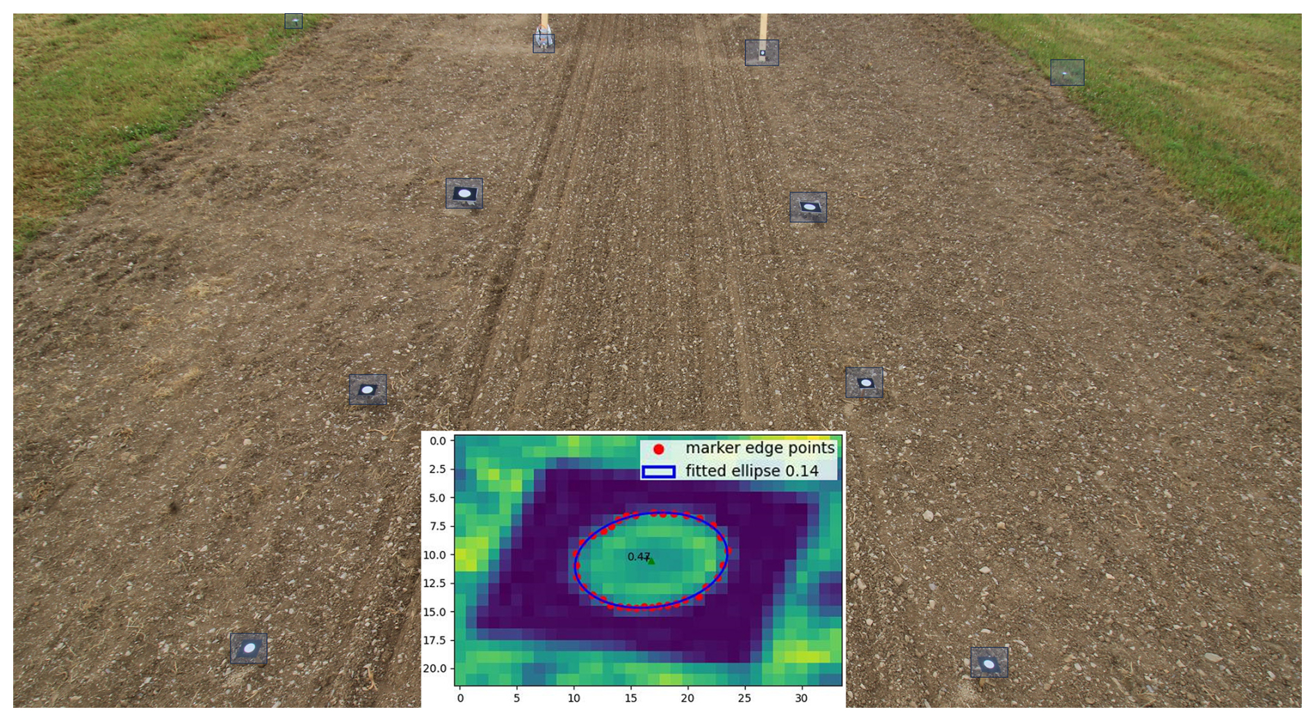To reliably track GCPs under varying environmental conditions, a two-stage approach was developed. Initially, a custom Keypoint-CNN (convolutional neuronal network) was trained to detect GCPs more robustly than traditional template matching methods. This model uses a bounding box to locate potential GCPs and a keypoint detector to pinpoint their center coordinates. To ensure no GCPs were missed, images were processed in overlapping 512×512-pixel patches. Next a k-means clustering algorithm was applied to group multiple detections of the same GCP, with the final coordinate determined by averaging the cluster. For additional technical details, refer to Blanch et al. (2025).