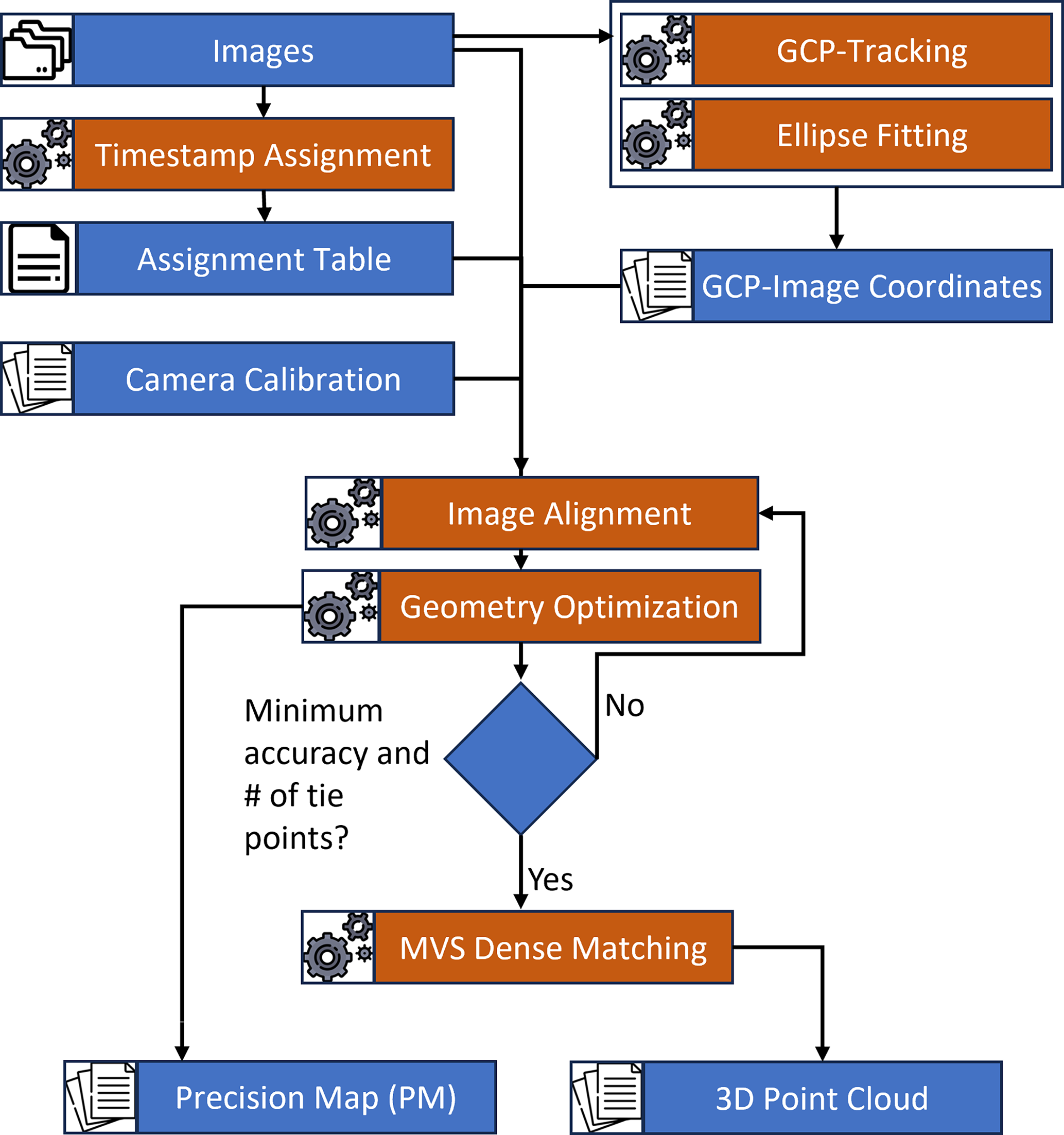Figure 9SfM photogrammetry workflow for time lapse data processing (GCP = ground control point, MVS = multi view stereo, PM = precision map).