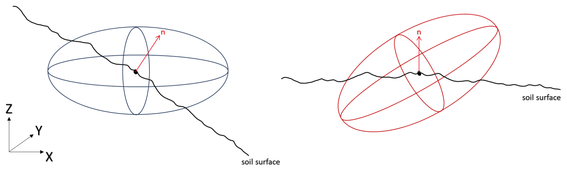 Figure 11Applying the transformation to the point cloud itself also requires applying the same transformation to the PMs (precision maps). Considering the precision values of a given point as a triaxial ellipsoid, the left image shows the situation in the local reference system, while the red vector shows the normal (n) direction and direction of the M3C2 (multiscale model to model cloud comparison). By rotation of the surface into the XY-plane, the ellipsoid must be rotated accordingly to preserve the orientation of the normal vector within it.