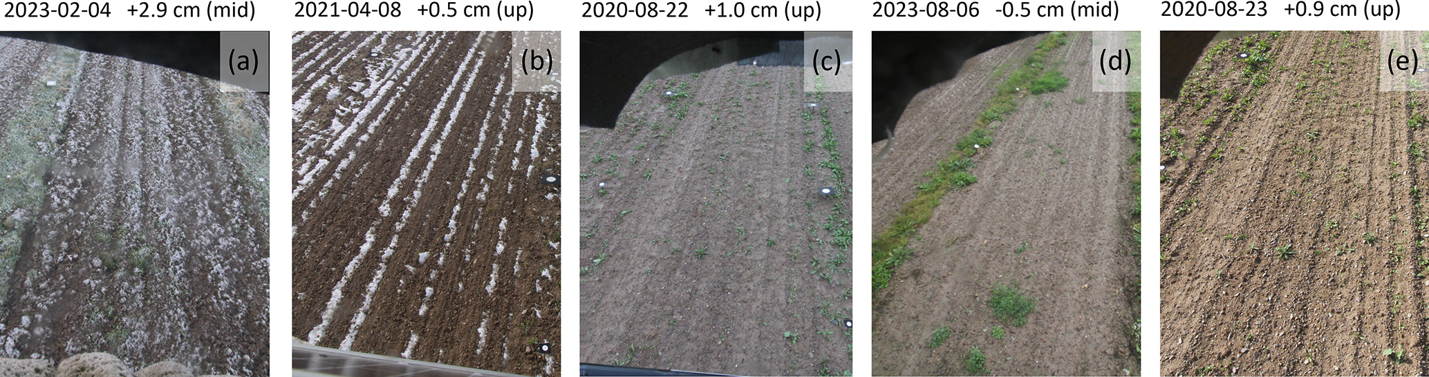 Figure 16Images on days of positive elevation changes/positive development. Panels (a) and (b) show examples of positive changes due to intense frost, in (c) during a rainfall event water covered areas arise on the surface, (d) is a combination of water coverage and plant growth of a few large plants and (e) pictures small plants all over the area of interest. The date, the elevation change in respect to the reference data, and the slope position are noted above.