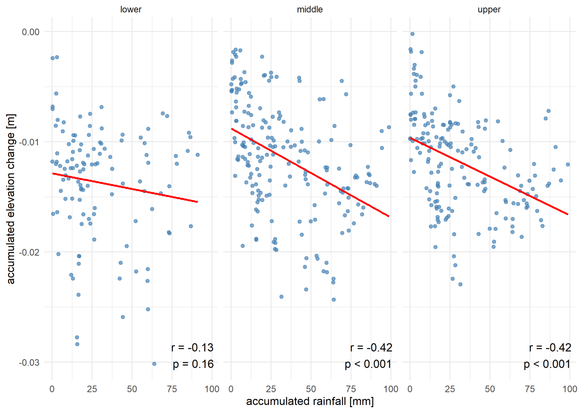 Figure 18Scatterplot of accumulated rainfall intensity in mm and the amount of accumulated elevation change in m for the lower, middle and upper slope positions (left to right). Pearson's correlation coefficient (r) and significance (p-value) are individually noted at the bottom. The winter months as well as days with positive changes due to water or vegetation covering the surfaces are excluded from the analysis.