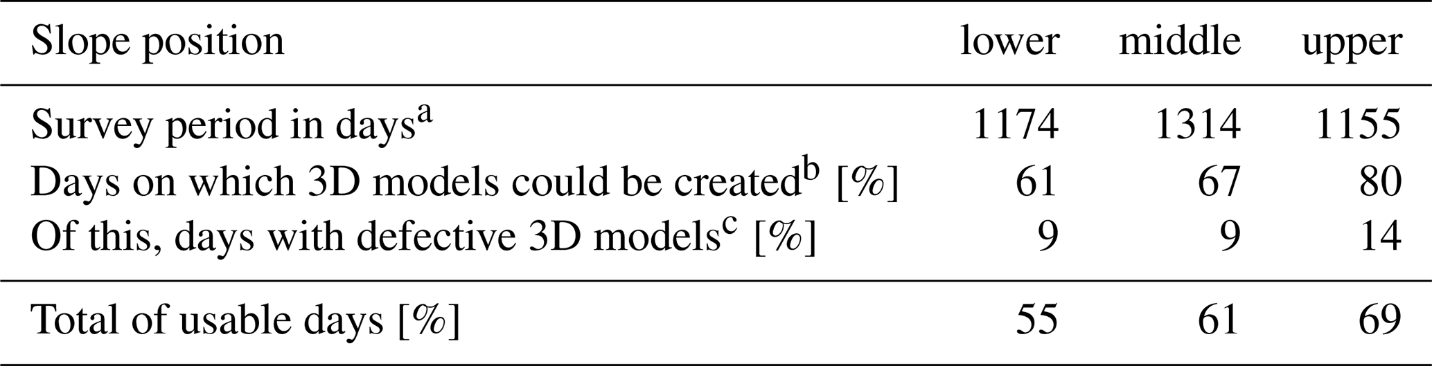 Data gaps occurred for several reasons. In November 2021, severe storm damage to the monitoring posts on both the lower and upper slopes resulted in extended data gaps for these positions (Table 1). Attempts to reconstruct the monitoring system were repeatedly hindered by adverse weather conditions and consequently an impassable surface for heavy machinery, delaying full functionality of camera systems until April 2022. Another system failure was recorded between 25 February 2023 and 3 May 2023. Table 1 summarizes the total number of survey days, excluding these long-term gaps. Additional daily data gaps arise when more than two cameras per post fail to capture usable compatible images, as 3D models require a minimum of three images for robust calculation.