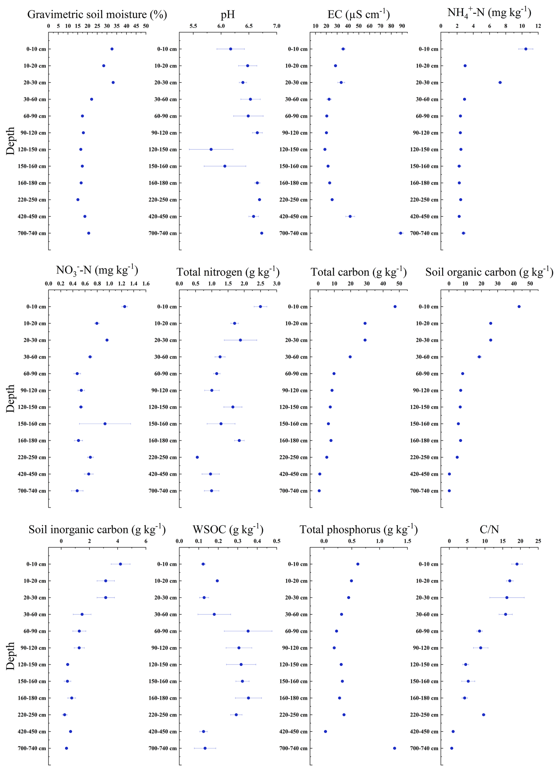 The concentration of nutrients in the soil gradually decreases with depth (Fig. 2). In the surface layer (0–30 cm), nitrogen content is lowest at the 10–20 cm depth. Electrical conductivity and total phosphorus content are highest at 700–740 cm. The WSOC content ranged from 0.123 to 0.355 g kg−1. On average, WSOC content was 0.246 g kg−1 in the upper 0–2 m layer, while below 2 m it decreased to an average of 0.183 g kg−1. The highest WSOC content, at 0.355 g kg−1, was observed between 160–180 cm.