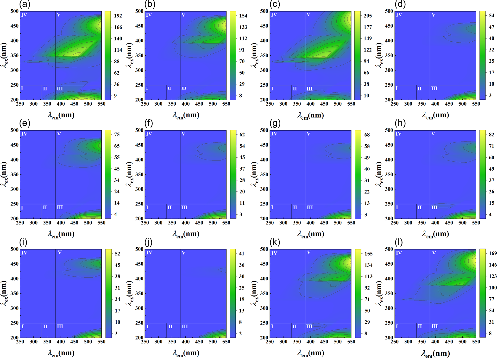 Figure 4EEM fluorescence spectra of WSOM at different depths. Regions I, II, III, IV, and V are, respectively, for tyrosine-like aromatic protein, tryptophan-like aromatic protein, fulvic acid-like matter, soluble microbial byproduct-like matter, and humic acid-like matter. (a) (0–10 cm); (b) (10–20 cm); (c) (20–30 cm); (d) (30–60 cm); (e) (60–90 cm); (f) (90–120 cm); (g) (120–150 cm); (h) (150–160 cm); (i) (160–180 cm); (j) (220–250 cm); (k) (420–450 cm); (l) (700–740 cm).