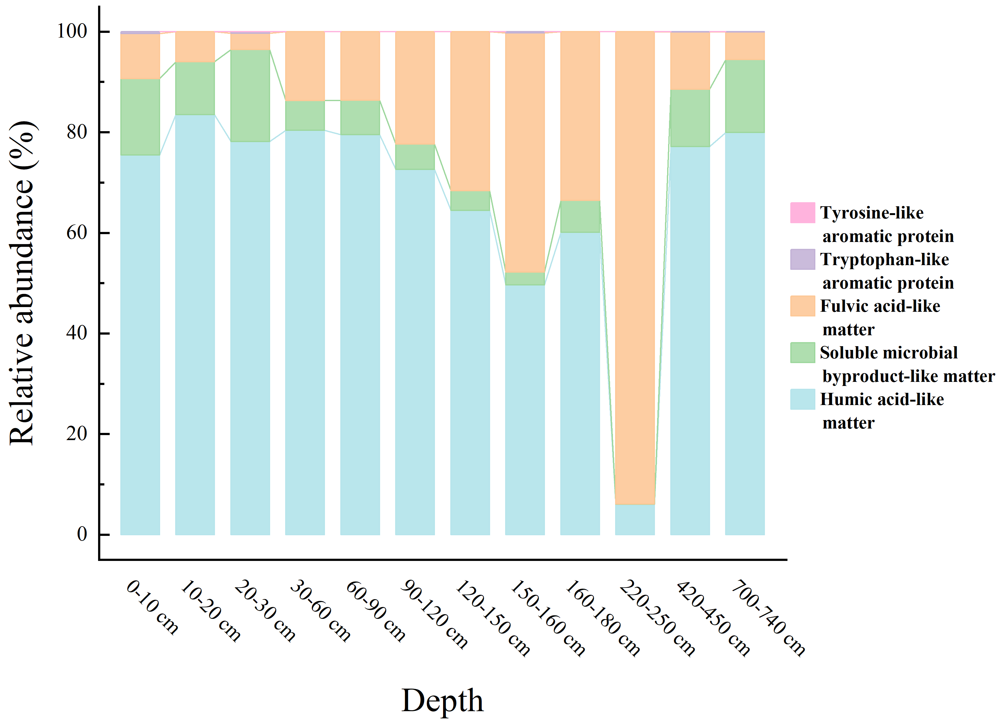 There were significant differences in the aromaticity and molecular weight of WSOC between the 0–60 cm depth and deeper layers within the boreal forest ecosystem (n=3, p<0.05) (Fig. 3). The WSOC in the 0–60 cm depth predominantly consists of components with higher aromaticity and larger molecular weights. In contrast, deeper layers have WSOC with smaller molecular weights and less aromaticity (Fig. 3). Additionally, three-dimensional fluorescence spectroscopy displayed two major fluorescence peaks (Fig. 4): one in Region III, representing fulvic acid-like matter, and another in Region V, representing humic acid-like matter. The fluorescence intensity of fulvic acids is high across all depths, with significantly greater intensity in the 0–30 and 420–740 cm depths compared to other depths (Fig. 5).