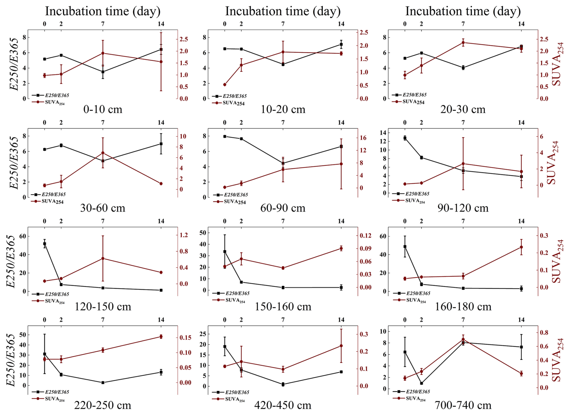 At 160–180 cm depth, SUVA254 values gradually increased over the incubation period, while E250 E365 value steadily decreases (Fig. 8). This indicates that as the incubation time increases, the aromaticity and molecular weight of the remaining WSOC also increase. In contrast, WSOC at other depths is rapidly decomposed during the initial stages of incubation, leading to a quick increase in SUVA254 and a rapid decrease in E250 E365 in the first 0–7 d, reflecting the rapid utilization of smaller, less aromatic molecules early in the incubation. The WSOC content at depths of 60–120 cm and the absorbance values at depths of 220–740 cm were extremely low by day 28, which likely resulted in very low SUVA254 and E250 E365 values on that day. As a result, we excluded these data from the analysis.