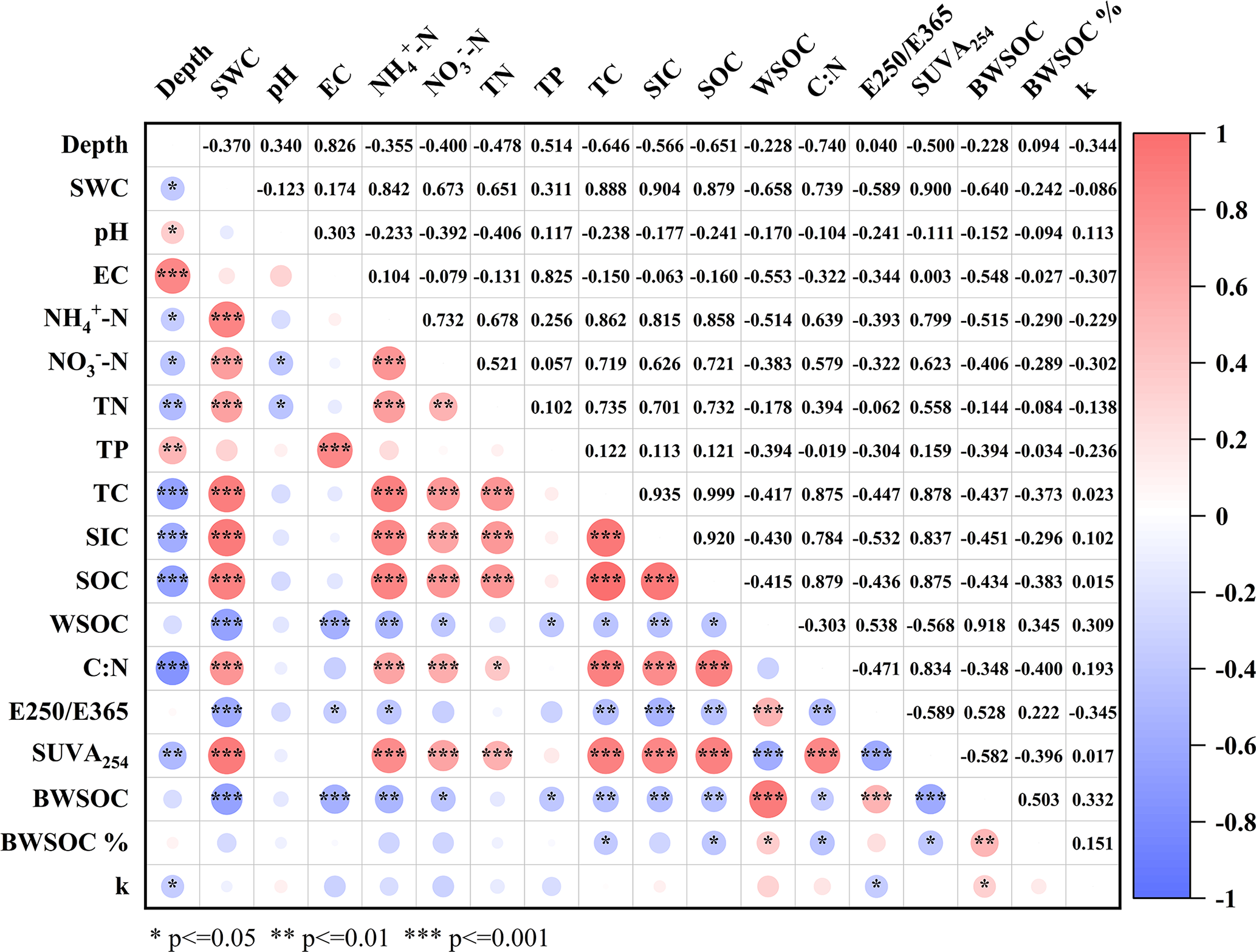 Total carbon (TC), total nitrogen (TN), WSOC and its degradability showed significantly negative correlations with depth. The aromaticity of WSOC (SUVA254) and molecular weight (E250 E365) showed significant correlations with biodegradable water-soluble organic carbon (BWSOC). E250 E365 showed a positive correlation with BWSOC (r=0.528), while SUVA254 was negatively correlated with BWSOC (). Additionally, SUVA254 and E250 E365 demonstrated a strong negative correlation (), suggesting that the molecular composition of WSOC significantly impacts its biodegradability. The degradation rate (k) and the degree of biodegradability (BWSOC%) of WSOC has no significant correlations with other physicochemical parameters (Fig. 9).
