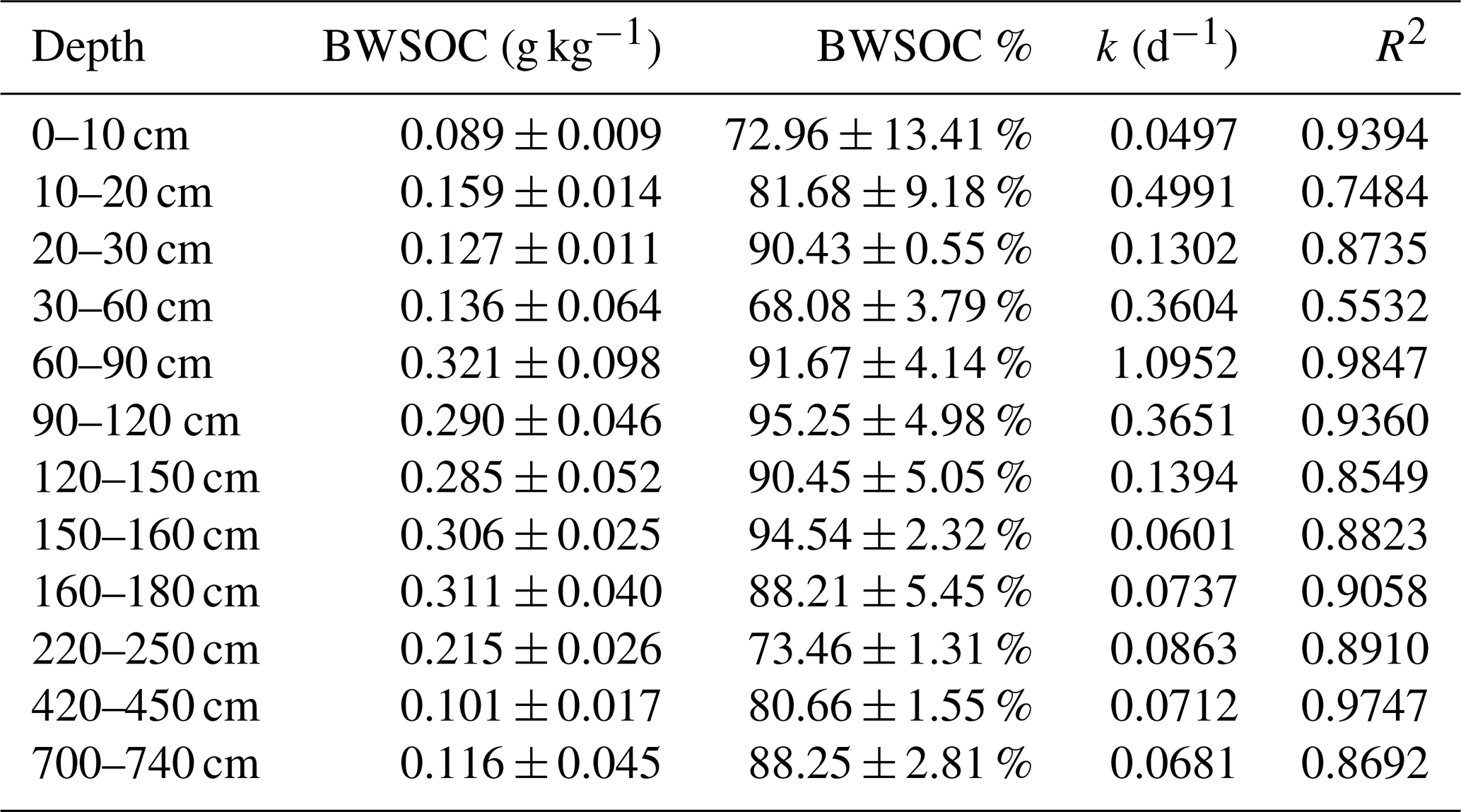 Table 2Content of BWSOC, BWSOC (%), reaction kinetics constant (k), and coefficient of determination (R2) at different soil depths.