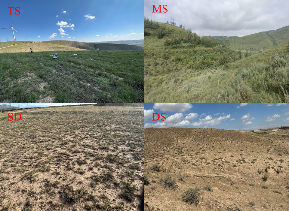 The study area (35°14′–39°23′ N, 104°17′–107°39′ E) is located in the Ningxia Hui Autonomous Region, China, with a total area of 66 400 km2, represents a transitional zone between the Loess Plateau and the Mongolian Plateau (Ji et al., 2023). Ningxia belongs to typical continental semi-humid semi-arid climate, and hosting a remarkable diversity of grassland ecosystems that cover 47 % of its land area – encompassing nearly all major grassland types found in northern China. In the southern Loess Plateau, meadow steppe (MS) and typical steppe (TS) dominate, with the TS concentrated near Guyuan City (e.g., Yunwu Mountain Grassland Nature Reserve). This area belonging to a semi-arid climate, with annual precipitation generally ranging from 300 to 400 mm, and is dominated by drought-resistant perennial tufted grasses, the soil is dominated by black clay. In contrast, MS is mainly distributed on the shady slopes and valleys of Liupan Mountains and other mountainous areas, where water conditions are better, the climate is more humid, and annual precipitation is generally around 400–600 mm. MS consists of perennial perennial and rhizomatous grasses in the middle of the arid zone, the soils are mainly mountain brown loam, mountain gray-brown soil and black clay. Desert steppe (DS) is distributed in the central and northern parts of Ningxia, representing a transitional zone between grassland and desert. It has an arid climate, with annual precipitation generally around 200–300 mm, and vegetation cover of 40 %–60 %, and is dominated by dry perennial grasses with participation of small dry shrubs. Steppe desert (SD) is distributed in the northern and northwestern parts of Ningxia, adjacent to the Tengger Desert and Mao Wusu Desert. The climate is extremely arid, annual precipitation is usually less than 200 mm, vegetation is sparse (< 30 %), and super-arid shrubs and small half-shrubs dominate (Zhang et al., 2025, 2023). The soil is predominantly light gray calcareous in DS and SD. This diversity offers a unique natural laboratory to investigate how varying ecosystems respond to climatic shifts.