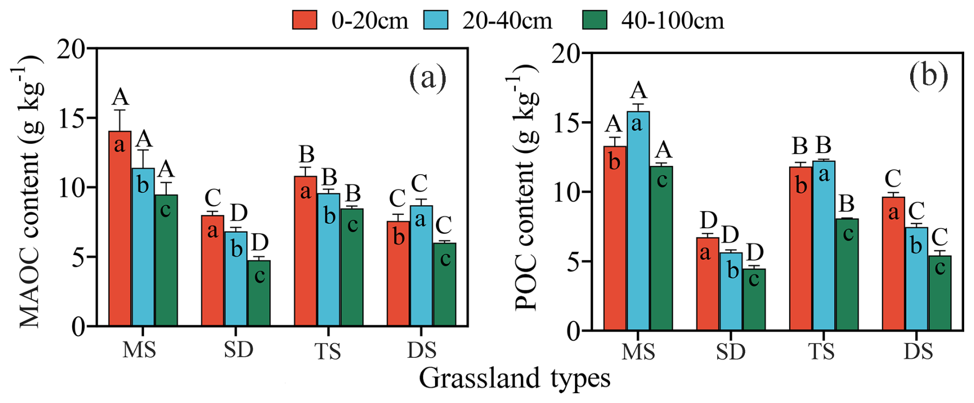 Figure 2Contents of MAOC (a) and POC (b) in 0–100 cm soil layers under different grassland types. Different uppercase letters indicate significant differences in different grassland types in the same soil layer, and different lowercase letters indicate significant differences in different soil layers under the same grassland types (p<0.05). MAOC: mineral-associated organic carbon; POC: particulate organic carbon. The bars in red, blue and green represent the soil layers 0–20, 20–40 and 40–100 cm respectively. MS: meadow steppe; SD: steppe desert; TS: typical steppe; DS: desert steppe.