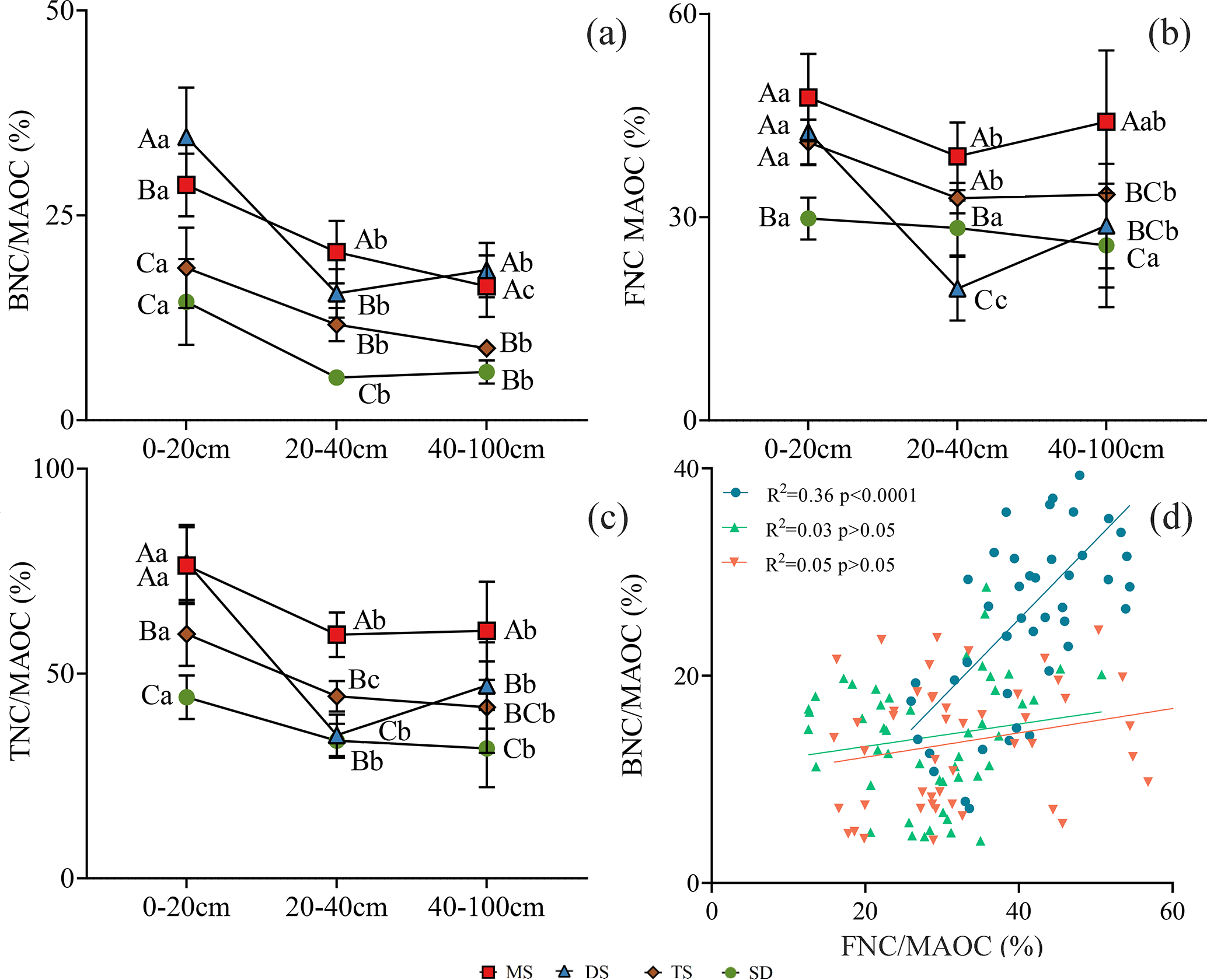 Figure 4The contribution of BNC, FNC and TNC in MAOC in different soil layers under different grassland types. (a) The contribution of BNC to MAOC; (b) the contribution of FNC to MAOC; (c) the contribution of TNC to MAOC. Different uppercase letters indicate significant differences in different grassland types in the same soil layer (p<0.05), and different lowercase letters indicate significant differences in different soil layers under the same grassland types (p<0.05). The red square, blue triangle, brown rhombus and green circle represent: meadow steppe (MS); desert steppe (DS); typical steppe (TS); steppe desert (SD). (d) the relationship between and . The blue circle, green triangle and orange inverted triangle represent the soil layers 0–20, 20–40 and 40–100 cm respectively. FNC: fungal necromass carbon, BNC: bacterial necromass carbon, MAOC: mineral-associated organic carbon.