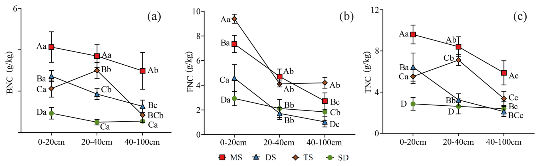 Figure 5Contents of BNC (a), FNC (b) and TNC (c) in POC in different soil layers under different grassland types. Different uppercase letters indicate significant differences in different grassland types in the same soil layer (p<0.05), and different lowercase letters indicate significant differences in different soil layers under the same grassland types (p<0.05). The red square, blue triangle, brown rhombus and green circle represent: meadow steppe (MS); desert steppe (DS); typical steppe (TS); steppe desert (SD). FNC: fungal necromass carbon, BNC: bacterial necromass carbon, TNC: total necromass carbon.