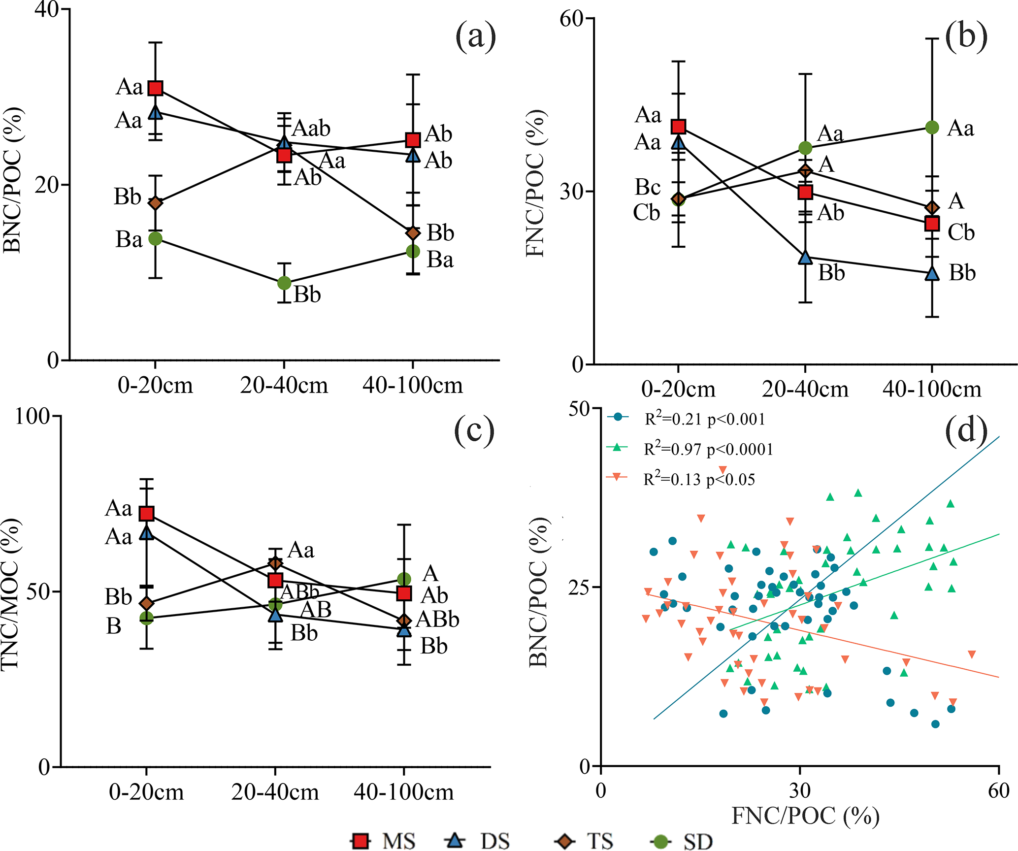 The contributions of BNC to POC were 13 %–31 %, 9 %–24 %, and 12 %–25 % in the 0–20, 20–40, and 40–100 cm layers, respectively (Fig. 6a). Similarly, FNC contributed 29 %–41 %, 19 %–38 %, and 16 %–41 % (Fig. 6b), while TNC contributed 42 %–72 %, 43 %–58 %, and 39 %–54 % to POC in the respective layers (Fig. 6c). The relationship of and were positively correlated in the 0–20 and 20–40 cm layer (R2 = 0.21, p<0.001; R2 = 0.97, p<0.0001). While, they were negative in 40–100 cm layer (R2 = 0.13, p>0.05), and no correlations at 40–100 cm layers (Fig. 6d).