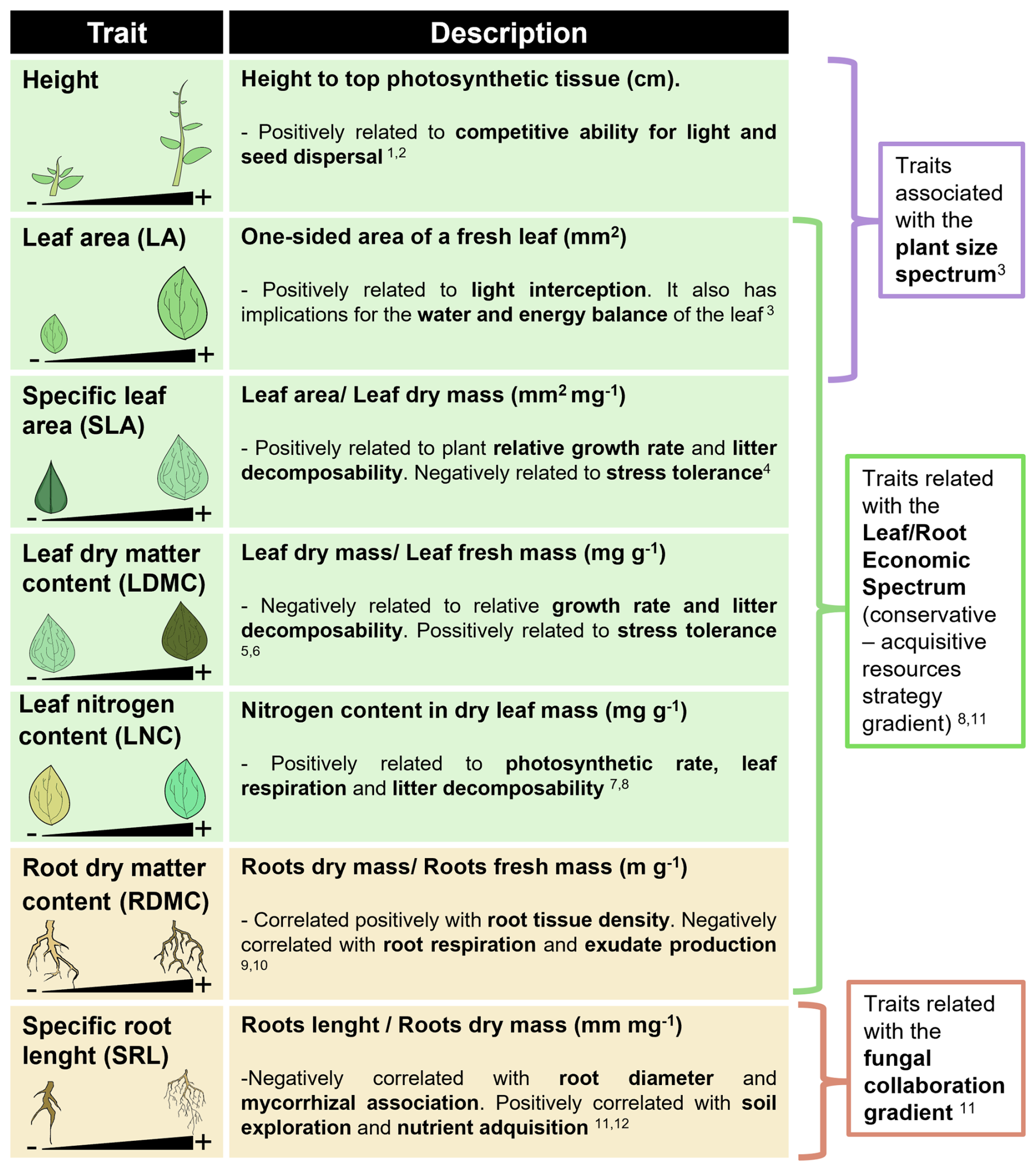 Figure 2Graphical representation and description of plant functional traits measured. References embedded in the figure are provided below: 1 Gaudet and Keddy (1988), 2 Thomson et al. (2011), 3 Díaz et al. (2016), 4 Poorter et al. (2009), 5 Kazakou et al. (2009), 6 Wilson et al. (1999), 7 Freschet et al. (2012), 8 Wright et al. (2004), 9 Guyonnet et al. (2018), 10 Roumet et al. (2016), 11 Bergmann et al. (2020), 12 Kramer-Walter et al. (2016).
