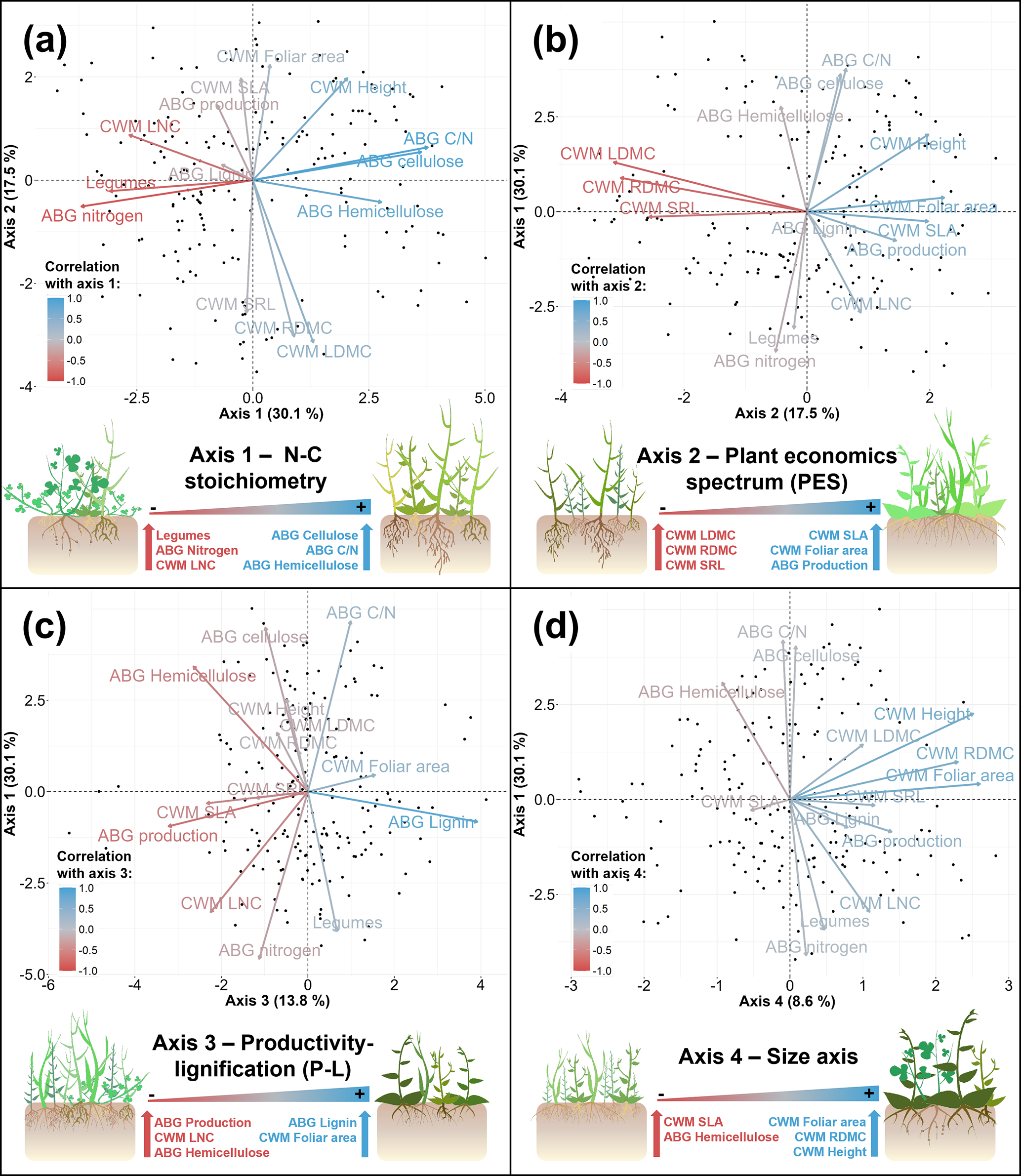 The analysis of vegetation functional traits and chemical composition revealed four main axes of variation. Two of these axes (axes 1 and 4) correspond to the spectrum of plant form and function, found in several global vegetation analyses (Díaz et al., 2016; Weigelt et al., 2021). This two-dimensional spectrum is defined by the leaf and root economic gradient (Kramer-Walter et al., 2016; Wright et al., 2004), that moves from slow-growing and resource-conserving to fast-growing and resource-acquisitive species (Wright et al., 2004), and the size gradient, which increases with increasing plant height and leaf area and reflects the competitive ability of plants for the light (Díaz et al., 2016).The other two axes (axes 2 and 3) are more related to the aboveground chemical composition of the vegetation. Axis 1 reflects the N-C stoichiometry of plant tissues, driven mainly by the ABG C N ratio, both of which are obviously negatively correlated with certain traits such as LNC and the proportion of legumes. The N-fixing capacity of legumes has a fertilising effect on companion plants, increasing its tissues nitrogen content (Pino et al., 2016). In addition, legumes themselves tend to have a high concentration of nitrogen in leaves and stems (Carranca et al., 2015). Axis 3 is positively related to the lignin content of the vegetation. This independence between lignin and nitrogen content in plant litter has already been observed (Cornwell et al., 2008). ABG productivity of vegetation was correlated with most of these axes, especially with axis 3, being higher in more acquisitive, less lignified and bigger vegetation, as found in other works (Laliberté and Tylianakis, 2012; Zhang et al., 2017).