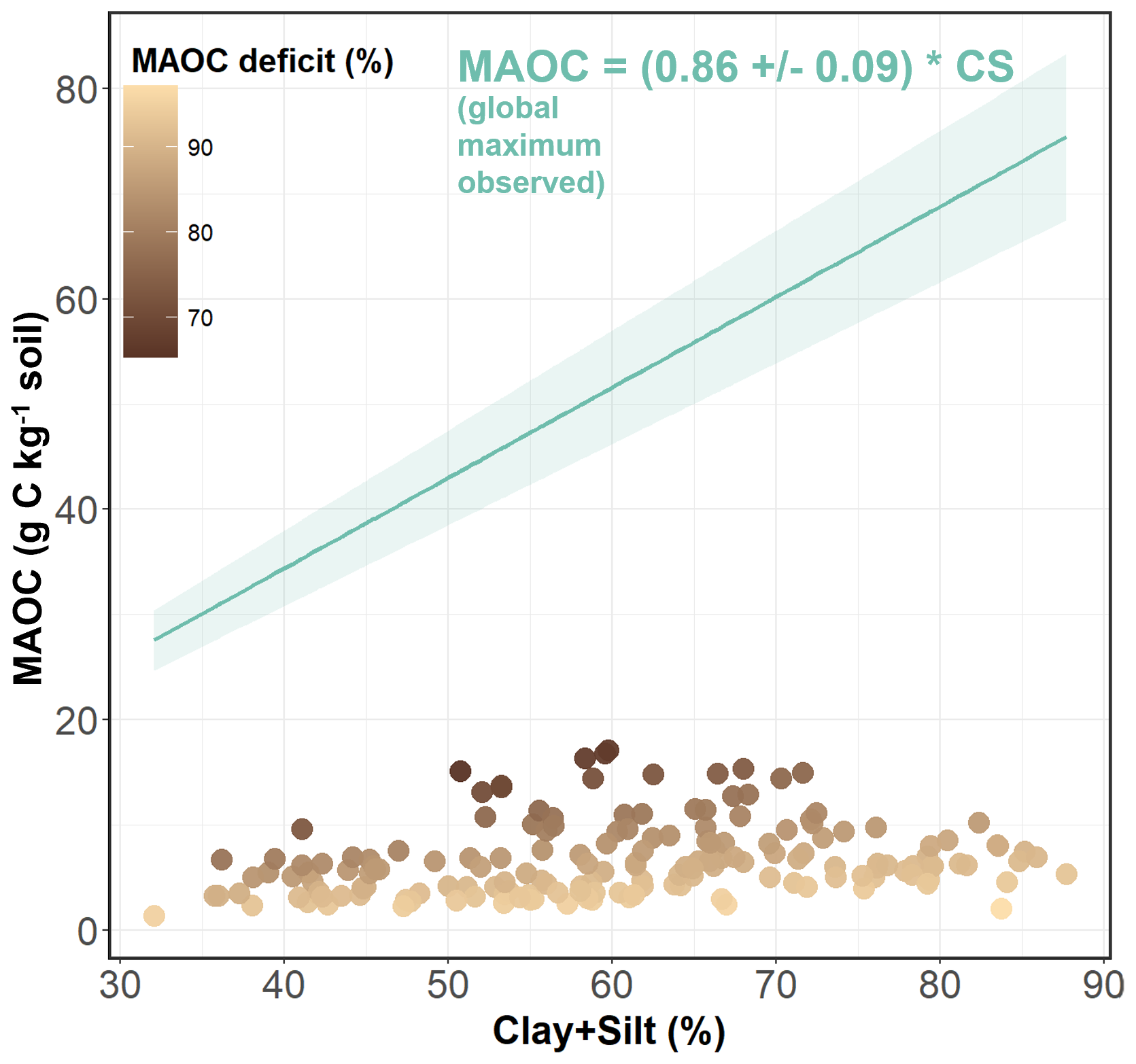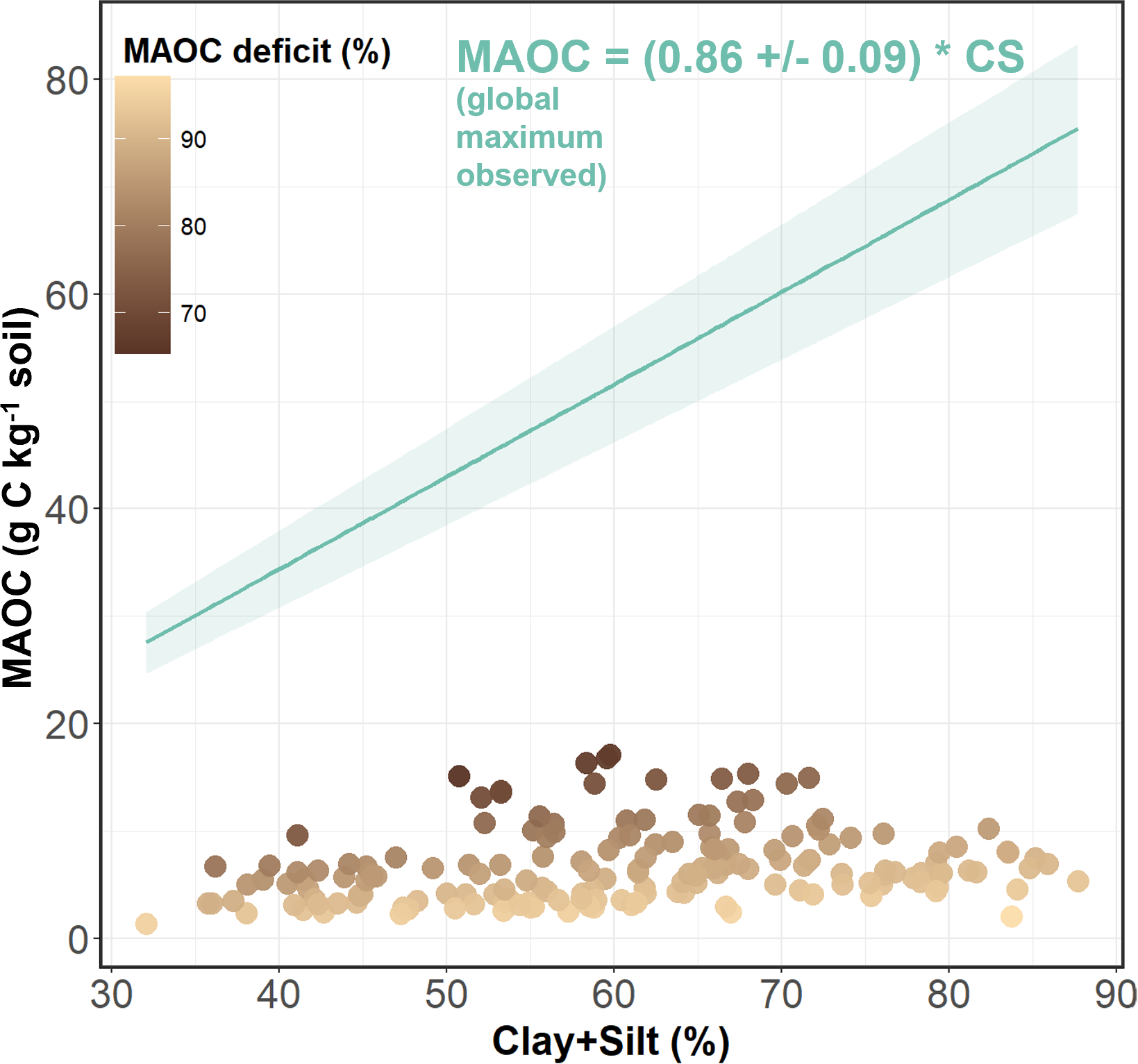 Figure 5Relation between the mineral-associated organic carbon (MAOC) and the percent Clay + Silt (CS) in the soil samples and the boundary line (in blue) with confidence intervals adjusted by Georgiou et al. (2022) for high-activity mineral soils, indicating the maximum observed mineralogical capacity for each CS content. The equation for the boundary line is provided in the panel. Points are colored based on their MAOC deficit (1 − MAOC content/MAOC maximum observed capacity).