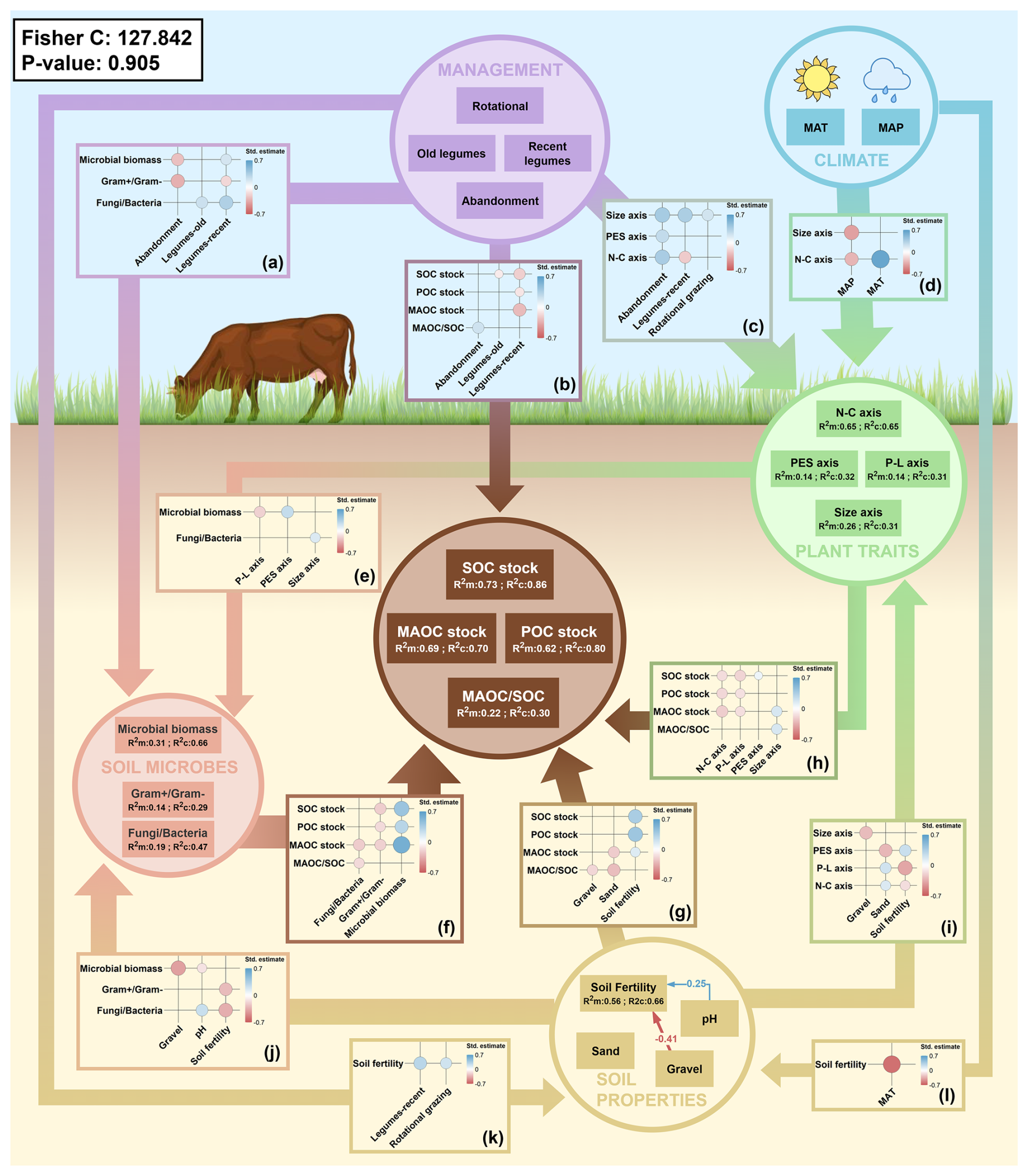 Soil fertility plays a central role in our models, increasing POC, MAOC and SOC stocks. Previous studies in grasslands have already observed a positive correlation between POC and MAOC and soil nutrients content (Wang et al., 2025). Global N addition experiments have also showed to increase topsoil C storage in grasslands (Hu et al., 2024; Liu et al., 2023). In this work, we observe a direct effect of soil fertility on C storage, but we also identify some indirect effects mediated by changes in vegetation and microbial communities. More resource-acquisitive and productive plant communities, with lignin content and lower C N ratio, were found at higher soil fertility. Resource-acquisitive plants are expected to be more competitive in nutrient-rich environments (Daou et al., 2021; Ordoñez et al., 2009). The absence of nutrient limitation also promotes plant productivity (Fay et al., 2015). In addition, soil fertility was negatively correlated with the Gram+ Gram− ratio. Gram- bacteria have a more copiotroph strategy than Gram+ bacteria and therefore benefit more from nutrient-rich environments (De Deyn et al., 2010; Luo et al., 2020; Zhong et al., 2010). The direct positive effect of soil fertility on C storage in soils may be explained by changes in other factors that we did not measure. For instance, nutrient addition have been shown to promote below-ground productivity in Mediterranean woody pastures (Nair et al., 2019) and in global grasslands (Liu et al., 2023; Lu et al., 2011). Moreover, nutrient availability in soils tends to increase CUE (Poeplau et al., 2019; Spohn et al., 2016) and to alleviate the need for microbial N-mining, reducing C losses and old SOM decomposition (Blagodatskaya and Kuzyakov, 2008).