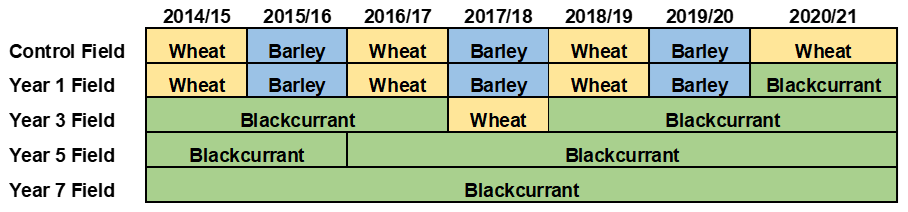 Figure 1Field cropping history for the arable control and regenerative blackcurrant fields (2014–2021). Discrete boxes represent one full cropping cycle and where applicable re-planting of new bushes.