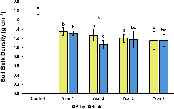 Figure 2Soil bulk density (n= 5) of alley (yellow) and bush (blue) regimes with increasing years of establishment. Error bars represent ±1 SD. For a given regime (alley or bush) dissimilar lower-case letters indicate significant (p 0.05) differences across the timeseries. At a given timepoint, * indicates a significant difference (p<0.05) between the alley and bush regimes.