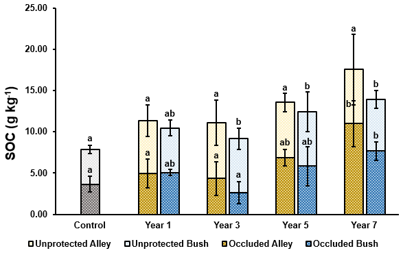 Figure 6Thermally labile SOC split by occluded (hashed) and unprotected (plain) carbon pools (n= 5) in the alley (yellow) and bush (blue) regimes. Error bars represent ±1 SD. For a given regime (alley or bush) dissimilar lower-case letters indicate significant (p 0.05) differences across the timeseries. At a given timepoint, * indicates a significant difference (p<0.05) between the alley and bush regimes.