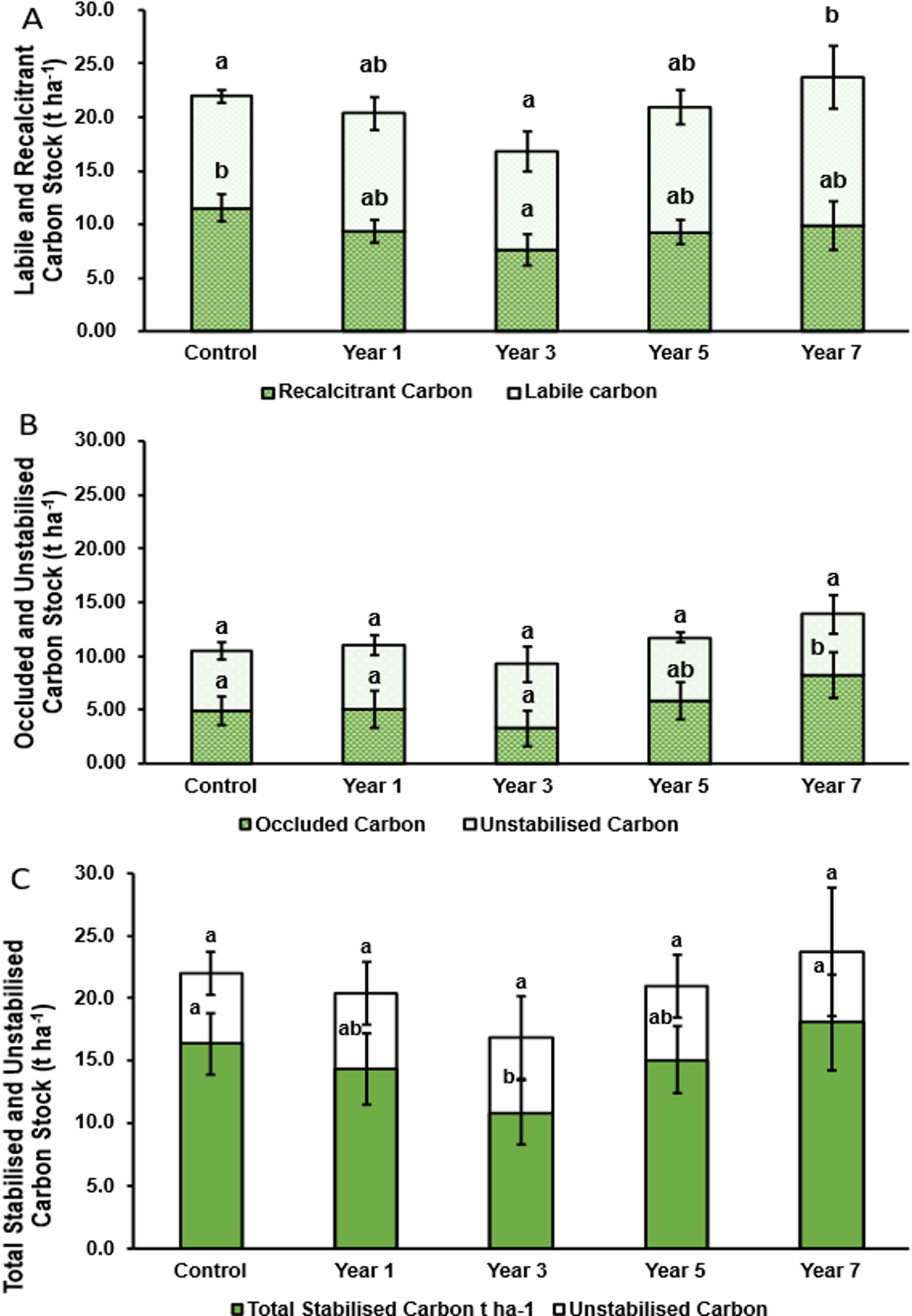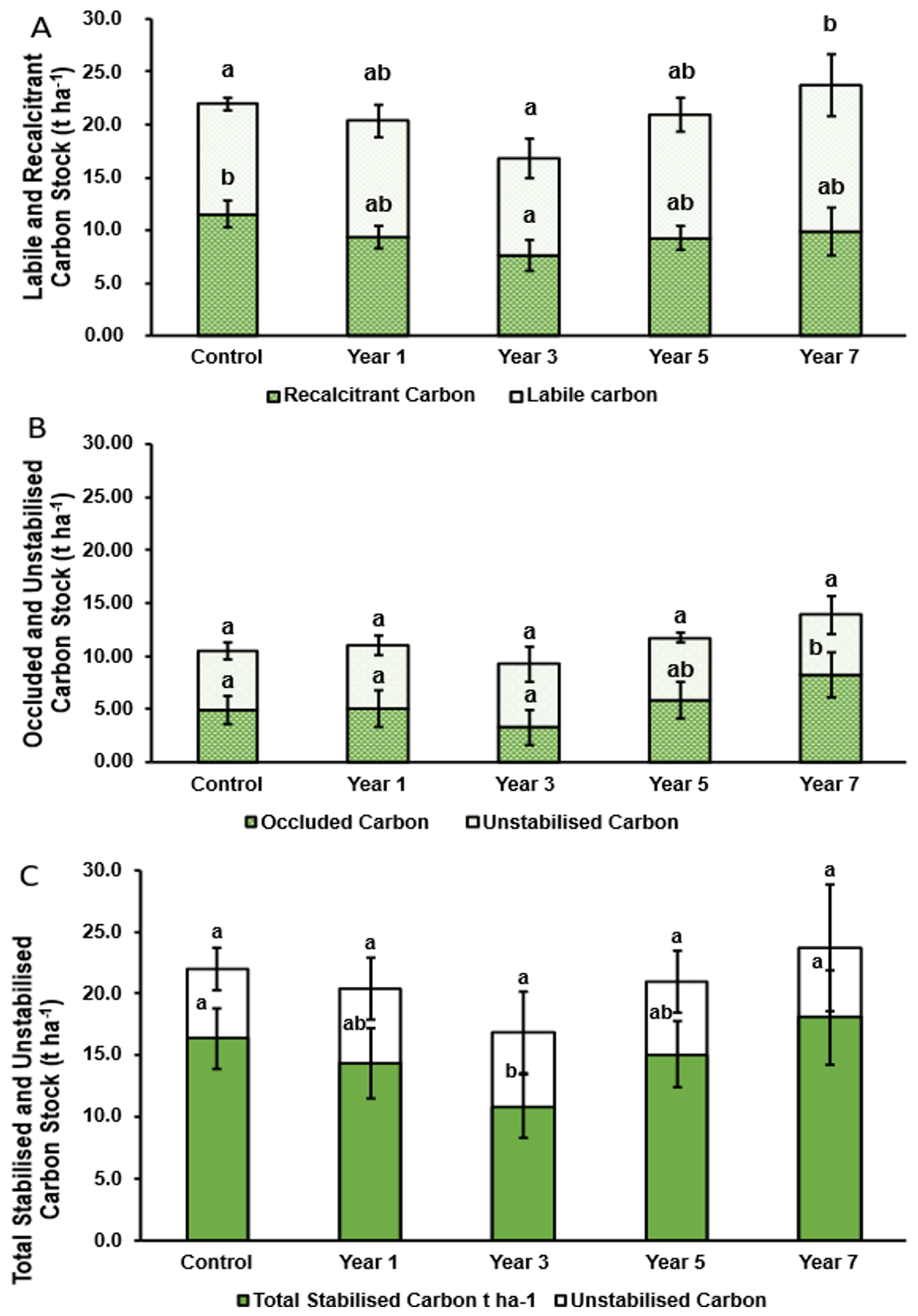Figure 7Carbon stock (n= 5) split by thermally recalcitrant carbon (hashed) and thermally labile carbon (plain) (A) and occluded carbon (hashed) and unstabilised carbon (plain) (B); and total stabilised carbon (Green) and unstabilised carbon (plain). Total stabilised carbon considered both recalcitrant and occluded carbon stocks. Error bars represent ±1 SD. Dissimilar lower-case letters indicate significant (p 0.05) differences across the timeseries.