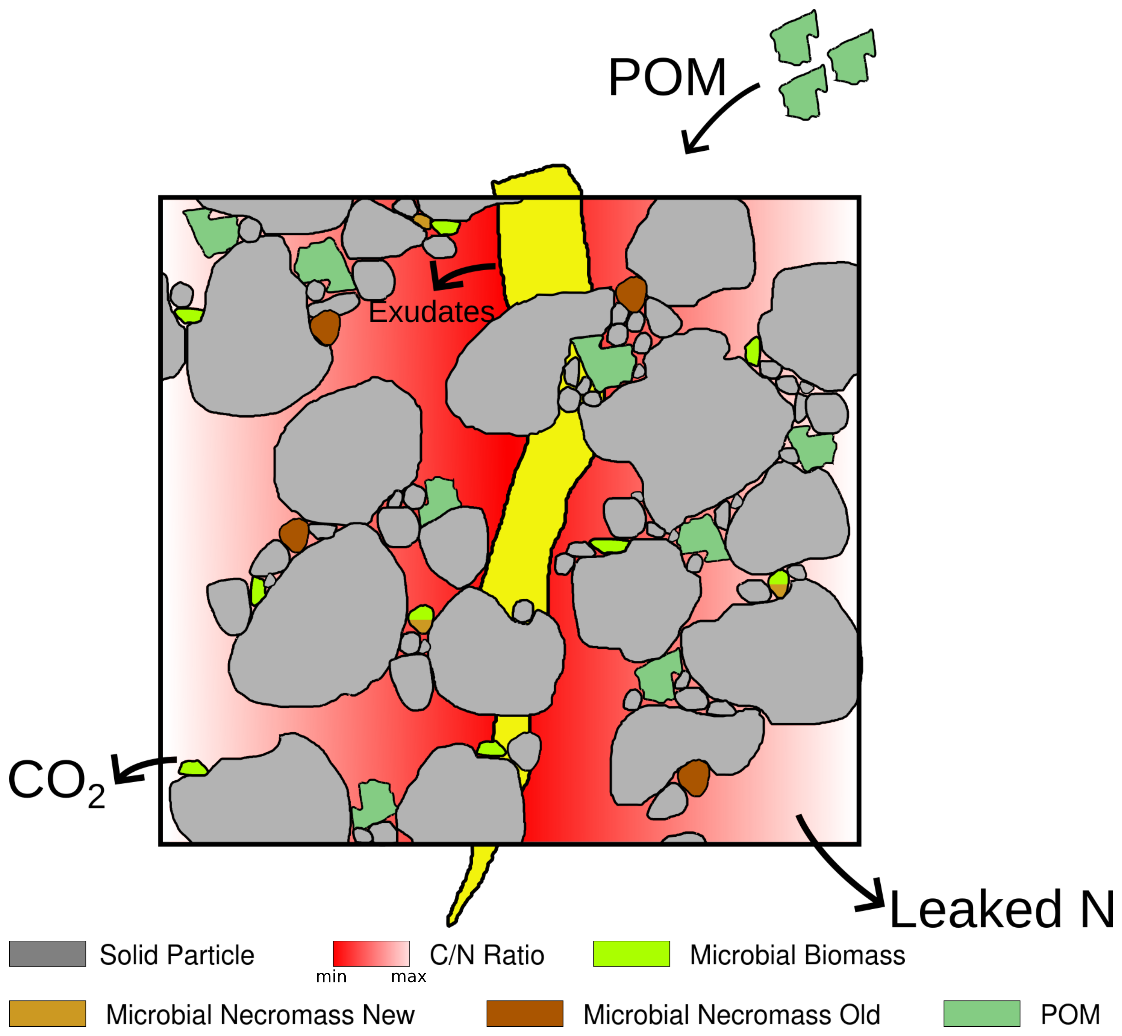 We introduce a process-based, spatially and temporally explicit micro-scale model that describes C and N pools and fluxes in soils along with the decomposition of particulate organic matter (POM), the development of microbial bio- and necromass, and simultaneous aggregate turnover. The latter is a consequence of the surface properties of soil particles, which are altered by the creation of gluing spots by microbes and organic remnants. The dynamic re-arrangement of primary soil particles and soil micro-aggregates impacts the spatial accessibility of OM and consequently its degradation rates. We also account for the input of root exudates as an easily available carbon source. These different model components are depicted in the conceptual drawing in Fig. 1, their interdependence and the transformation between them in Fig. 2. The relations are specified in more detail in Sect. 2.2.