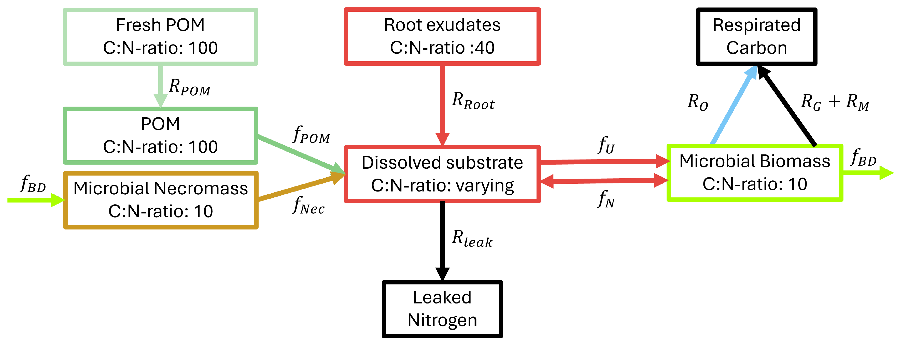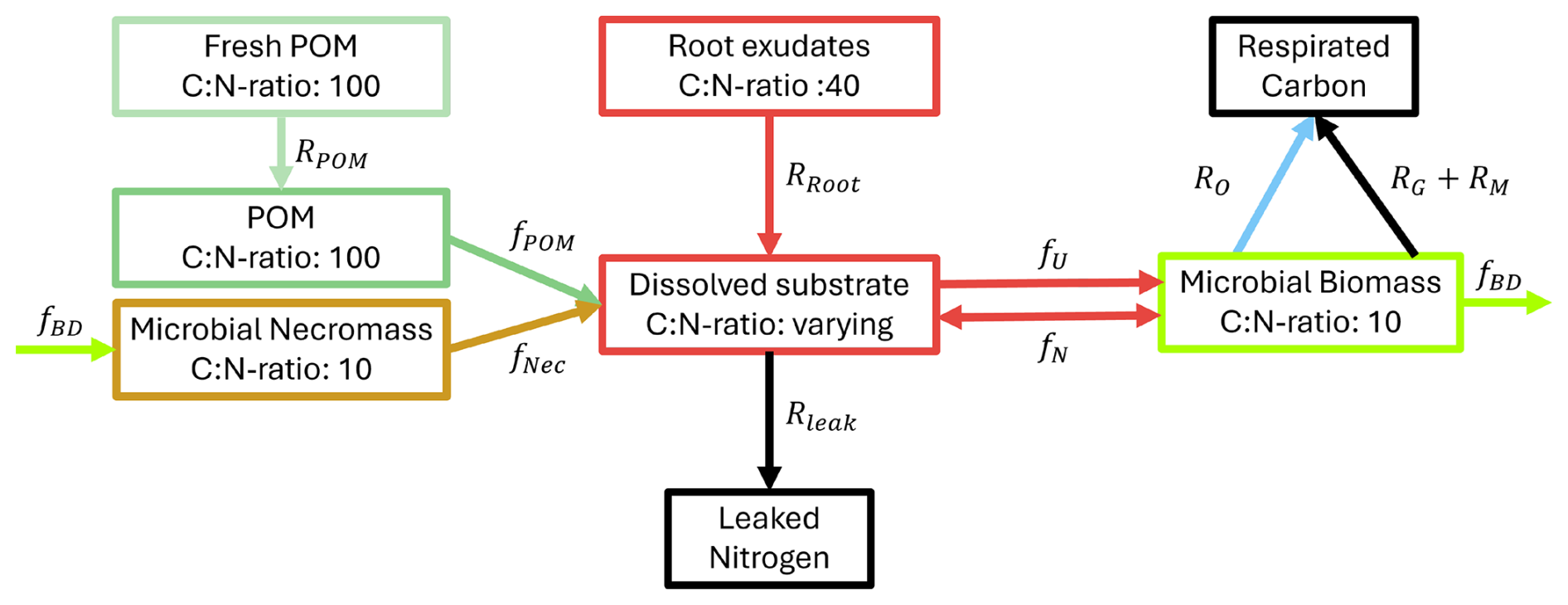 Soil solution with dissolved organic C and (in-)organic N (dynamic ratio) is taken up by microbial biomass for growth and maintenance,