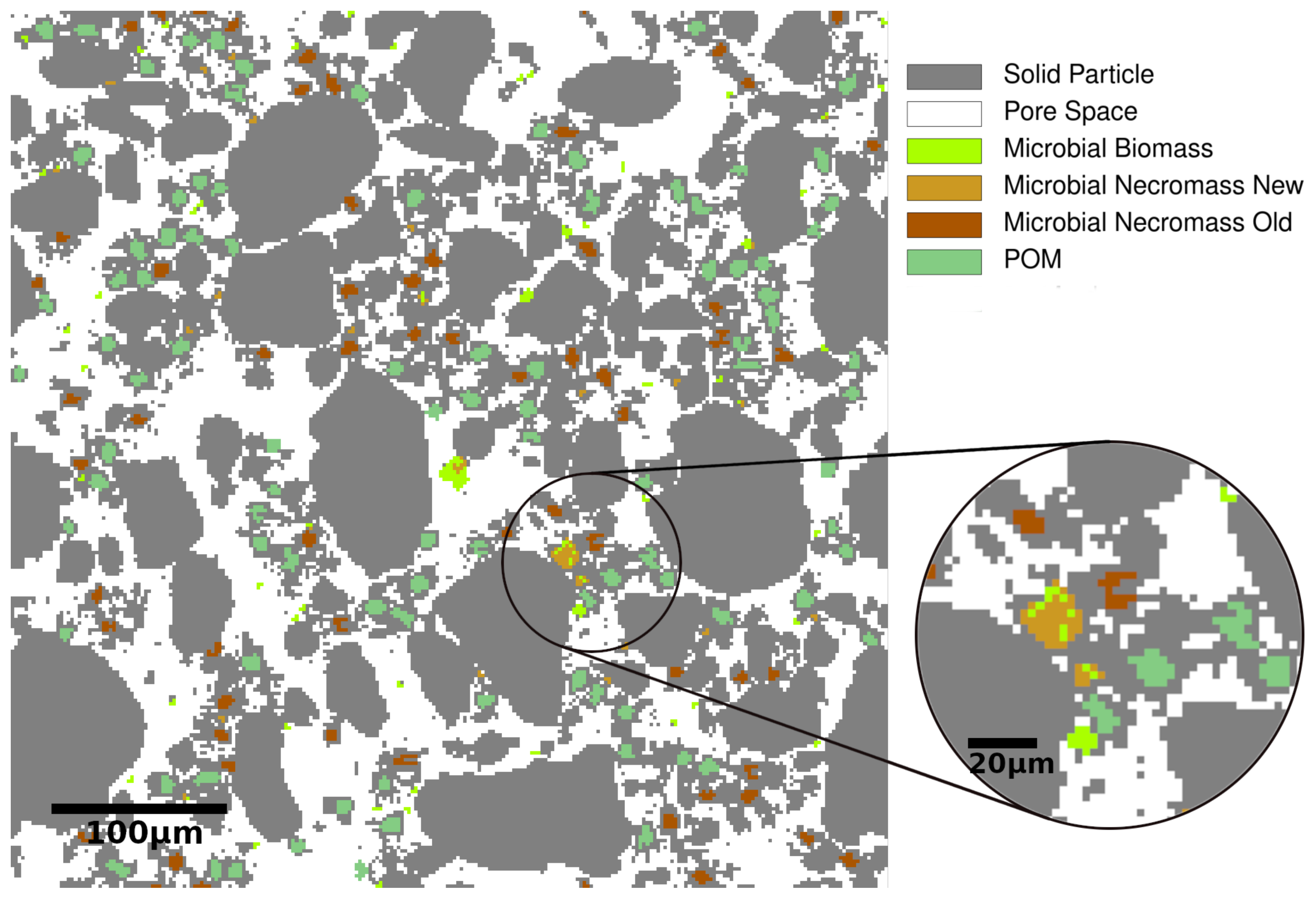 For the Cellular Automaton Method (CAM), a computational domain (here: (500 × 500 × 1) µm3) is discretized into cells (here: voxels of size 2 µm × 2 µm × 1 µm), which are the smallest entities of the model. A specific type or state is assigned to each of these cells: solid, pore, POM, biomass or necromass. Several cells may be combined to larger entities to mimic a primary mineral soil, POM or necromass particle or micro-aggregate. While soil, POM, necromass, and pore cells have exclusive states, biomass cells may include both living bacteria and necromass due to the continuous turnover of living bacterial biomass into necromass. Pores as well as biomass cells may additionally contain dissolved substrates such as DOC and dissolved N.