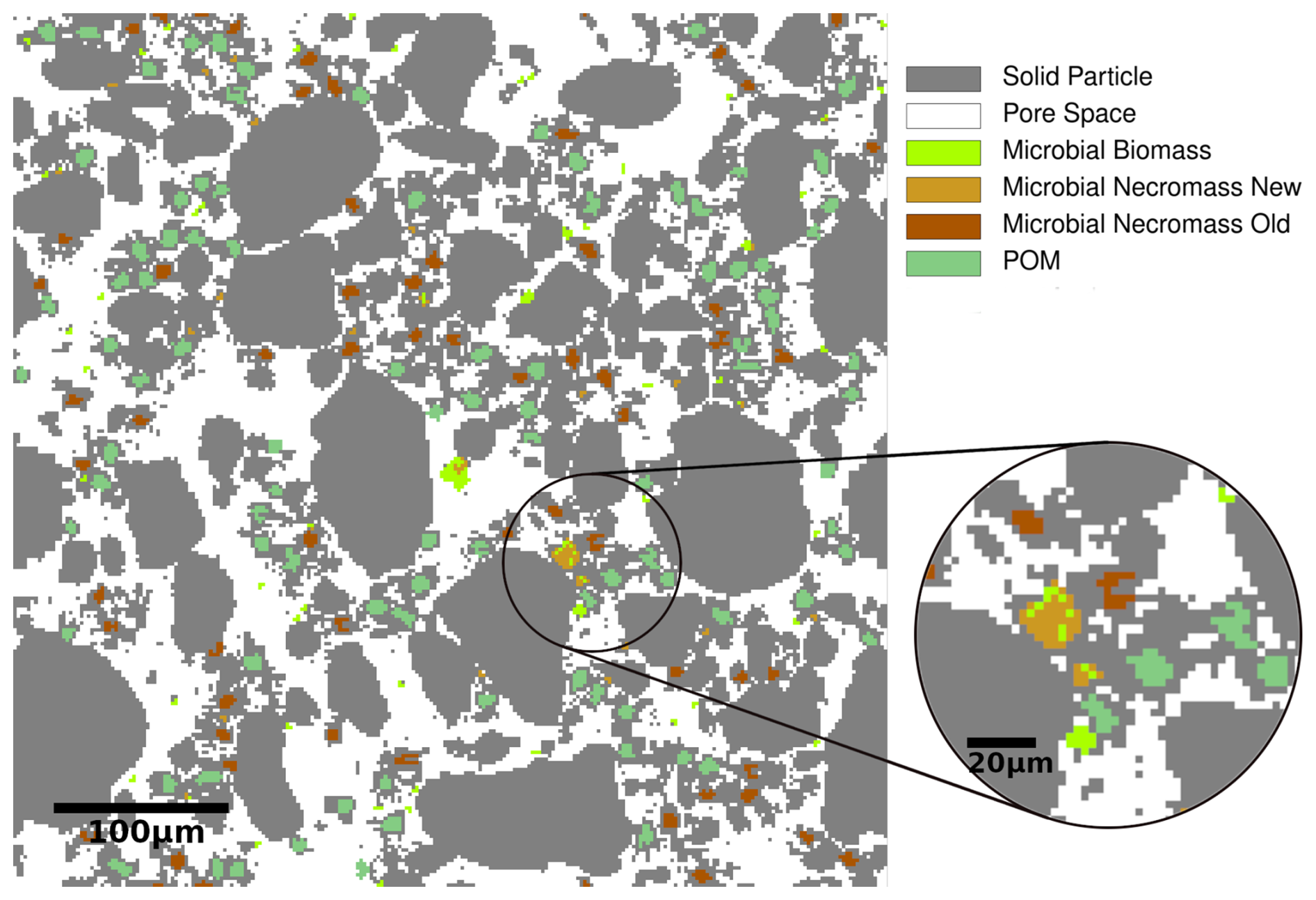 To create an aggregated initial state after the initial random placement of particles, the solid building units, POM and necromass particles are relocated within our cellular automaton framework due to their mutual attraction over 500 steps (without reactions taking place, see also the work flow in Fig. 4).