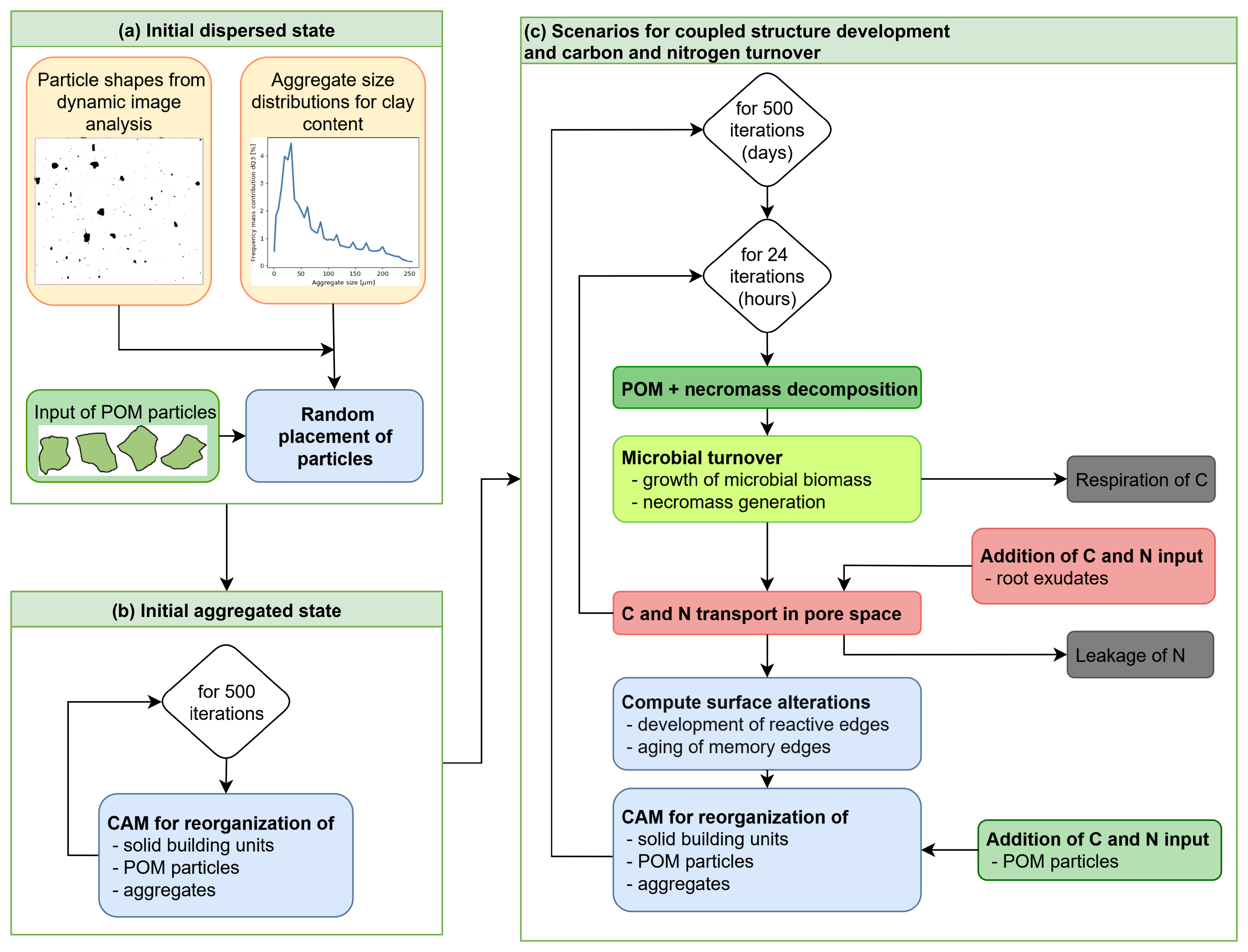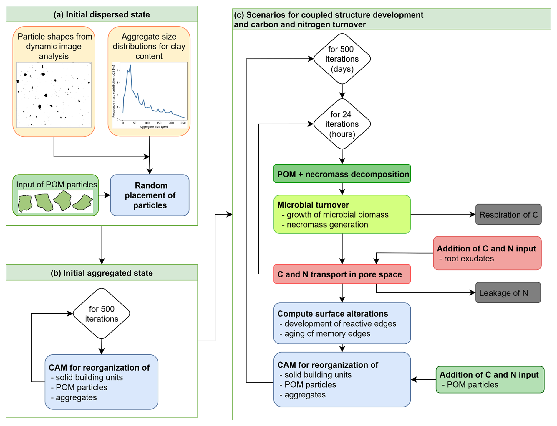 Figure 4Workflow for the simulations: (a) Creation of initial dispersed state, (b) application of CAM to create initial aggregated state, and (c) carbon and nitrogen turnover coupled with structure development in 500 d scenarios.