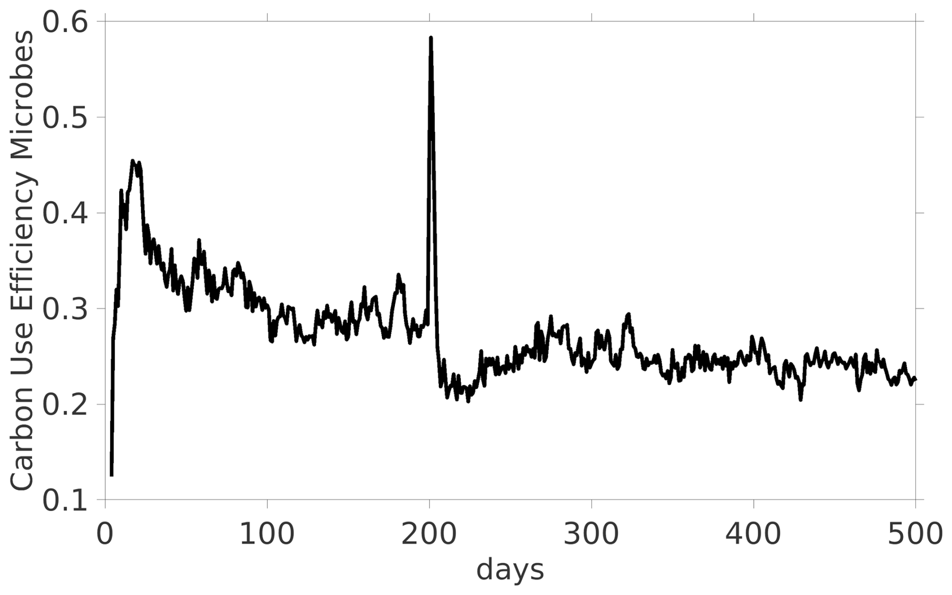 Finally, we present the temporal dynamics of the CUE of microbes. For the dynamic equilibrium between day 100 and 200 there is a CUE with a mean of 0.289. The CUE immediately reacts on the exudate pulse on day 200 and its peak is obtained on day 201 with a value of 0.583, see Fig. 6.