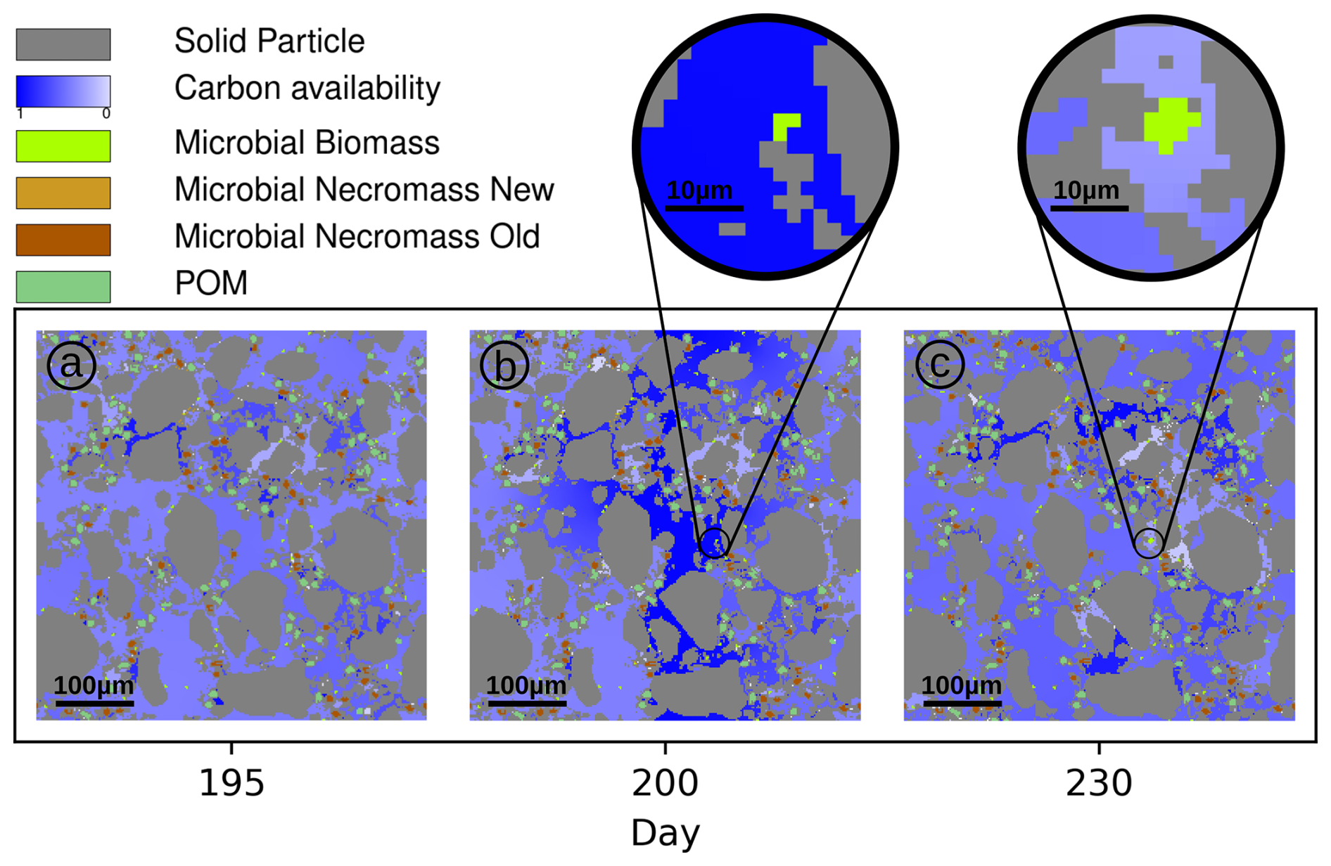 As the connectivity in the pore space essentially determines the local availability of dissolved C and N in the domain (Zech et al., 2022a), this results in locally variable microbial growth. If both substrate and consumer (microbes) are connected in small but isolated pores we observe that C is depleted, i.e. the availability (see definition above) is less than 0.4 (light blue regions in Fig. 7). In large, connected pore spaces, the amount of dissolved C available to the biomass is up to 0.7. Note that degradation of POM and microbial necromass also generates new DOC. On the other hand, in pores that are disconnected from living biomass, the C availability remains high, with values up to 1.0 (dark blue zones in Fig. 7). As we explicitly take into account the restructuring of the pore space, the connectivity may dynamically change. At day 200 C-rich exudates enter the center of the domain (dark blue regions of Fig. 7b). Connected regions near the source of root exudation facilitate high C uptake rates by microbial biomass, leading to an increase in microbial growth (example: Fig. 7, black circles). The microbial community grows in that hot spot under favorable conditions between day 200 (Fig. 7b) and 230 (Fig. 7c). In contrast, disconnectedness, i.e. physical barriers may prevent substrate exchange and so, new C-rich pores may persist after the exudate pulse because no consumers have access to them. As such the microbial dynamics are significantly impacted by structural changes and locally highly diverse.