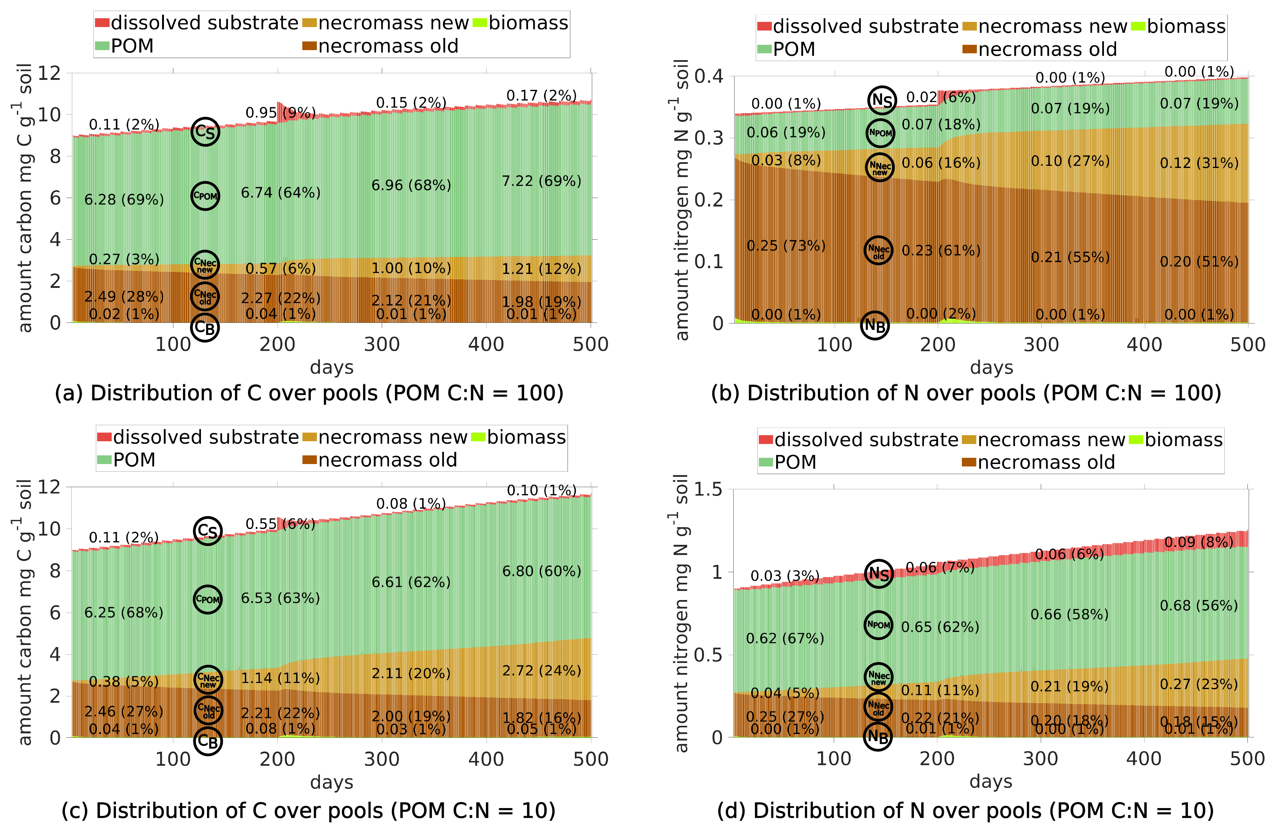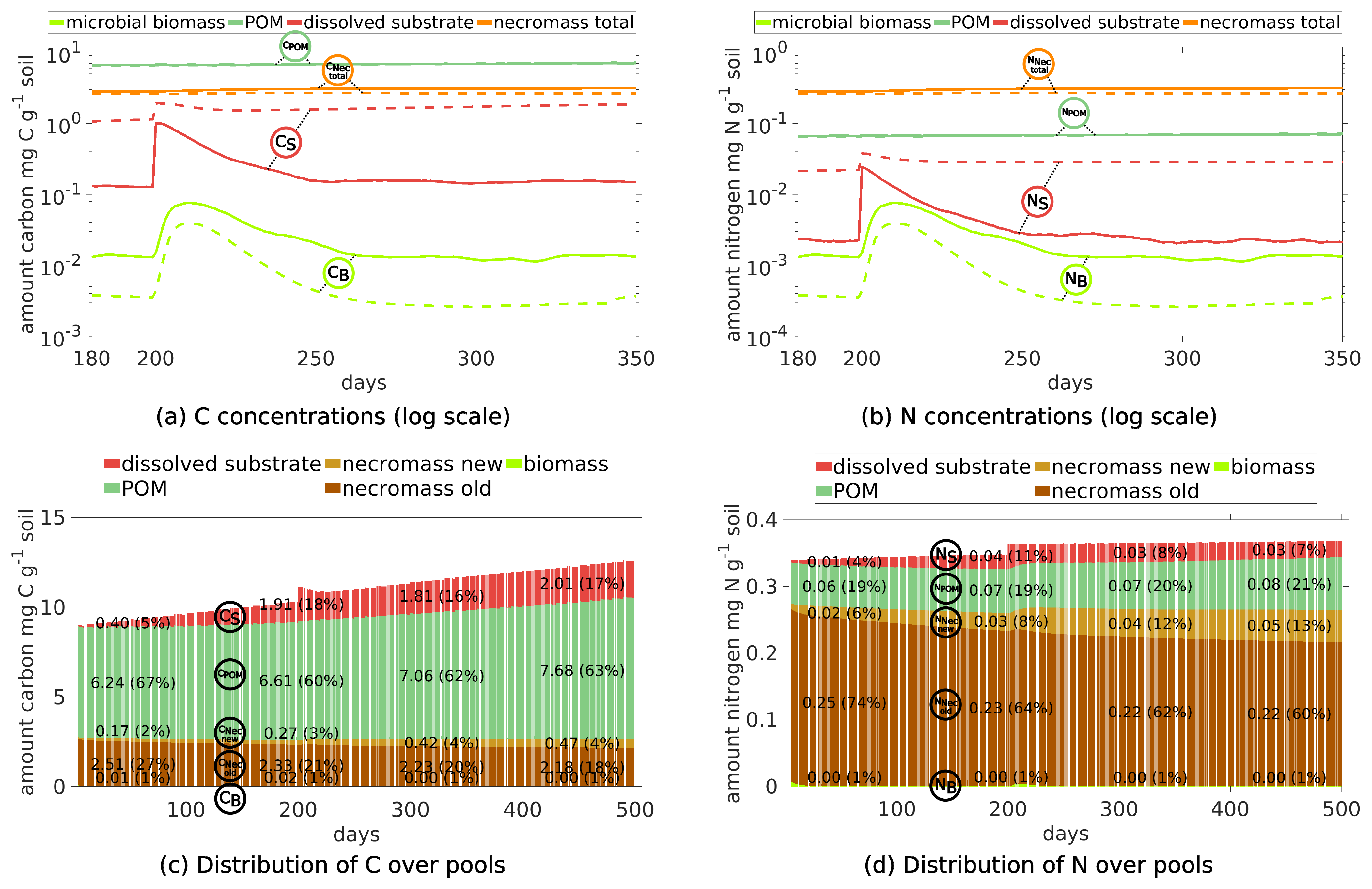 Dynamics of C and N pools. The evolution of the C concentrations in the distinct pools are depicted in Fig. 5a and the respective shares are illustrated in Fig. 5e. We observe the increase of POM due to its continuous addition (dark green curve), the slow degradation of initially present necromass (dark brown) and the generation of new necromass over time (light brown) due to the death of living biomass. Departing from the initial state the C concentrations in the soil solution (red curve), the total necromass (orange curve) and – after approximately 75 d – also the microbial biomass (light green curve) tend to dynamic equilibria. The N concentrations show the corresponding behavior (Fig. 5b and f).