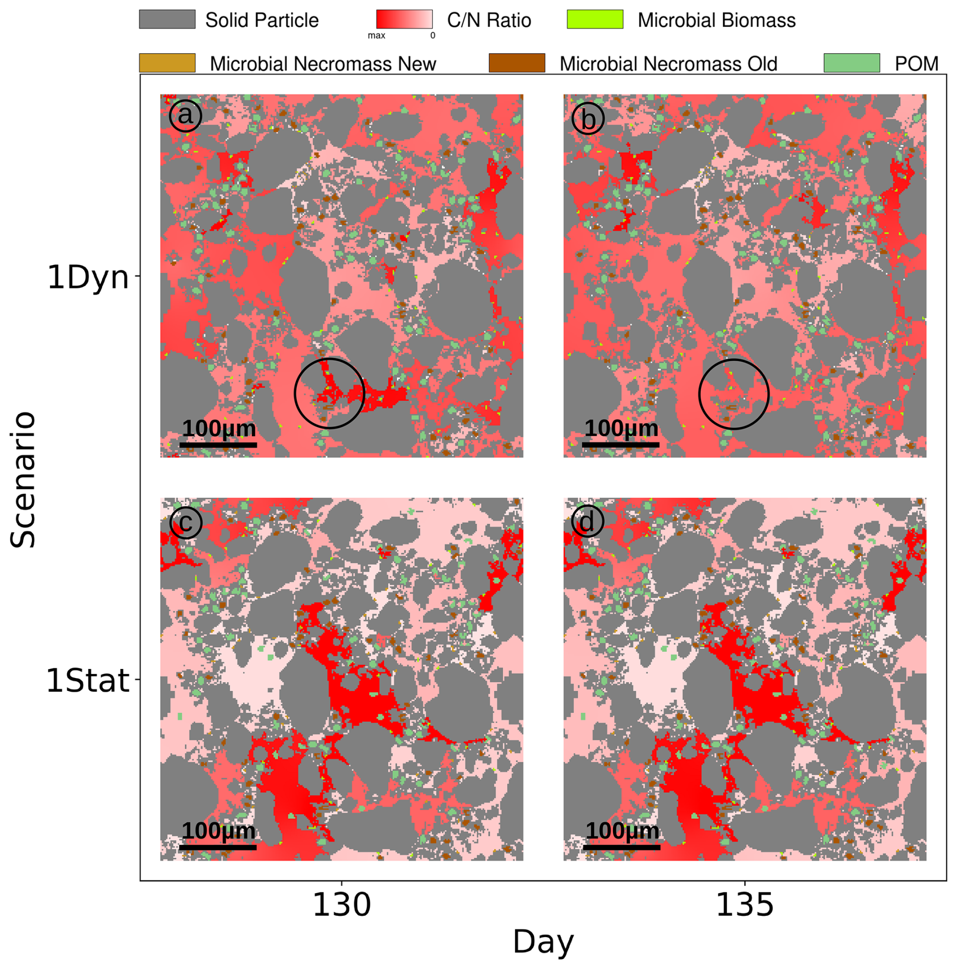 We observe two notable differences in the Scenario Static: The increased concentrations of dissolved C and N (broken red lines in Fig. 8a and b), and at the same time the biomass concentrations exhibit a lower level (broken light green lines), e.g. C in microbial biomass is only 30 % of the amount of C in biomass in Scenario DynamicReference. Ten days after the exudate pulse the microbial biomass peaks at 0.039 mg C g−1soil, which is 49 % less compared to the scenario with particle movement. After 250 d, the effect of the pulse has vanished and dissolved N decreases slightly, while dissolved C continues to increase, but with less incline than before the pulse. In general the amount of dissolved carbon in Scenario Static is up to 8 times higher compared to Scenario DynamicReference, dissolved nitrogen even up to 10 times higher. The distributions of C and N in the pools in Fig. 8c and d underline the effect of structure dynamics if compared to Fig. 5e and f). More DOC and dissolved N remains in solution in the static scenario, less active biomass and less necromass is generated due to its limited access to the available nutrients. Without movement of the particles TOC increases to 1.26 % of the soil's mass at the end of simulation. The difference of 1.96 mg C g−1 soil between both Scenarios, DynamicReference and Static, is a consequence of the lower CO2 respiration in Scenario Static. Furthermore it can be noted that the dissolved substrates and microbial biomass are fluctuating more in Scenario DynamicReference, which is a direct consequence of the break-up of structures/bindings among the particles and thus changing connectivity between POM, necromass and biomass. For illustrating these mechanisms, Fig. 9 shows two snapshots at day 130 and 135 visualizing the spatial distribution of the ratio in the soil solution. While the distributions of the static geometries are almost identical (c and d, Scen. Static), the distribution changes in the Scenario DynamicReference (a and b). The circled area points to the break-up of a structure that isolates two regions with high and low at day 130. At day 135 the rearrangement of particles connected the two pore regions and the C and N concentrations equilibrated. In general, the difference of the ratios between unconnected pores is higher in Scenario Static, leading to a pronounced patchiness. The amount of dissolved C and N in the pores is depending on the connectivity: In pores that are separated from spots with microbial biomass by physical barriers the dissolved C accumulates and exhibits a high potential carbon availability and ratio. In contrast, in isolated pores containing microbial biomass, C and N are consumed, but without fresh C and N sources the ratio in solution can increase while the uptake decreases until the biomass is not able to fulfill its basal activity and degrades. As such the impact of soil restructuring on carbon and nitrogen dynamics is evident, compare also the summarized final states in Fig. 11.