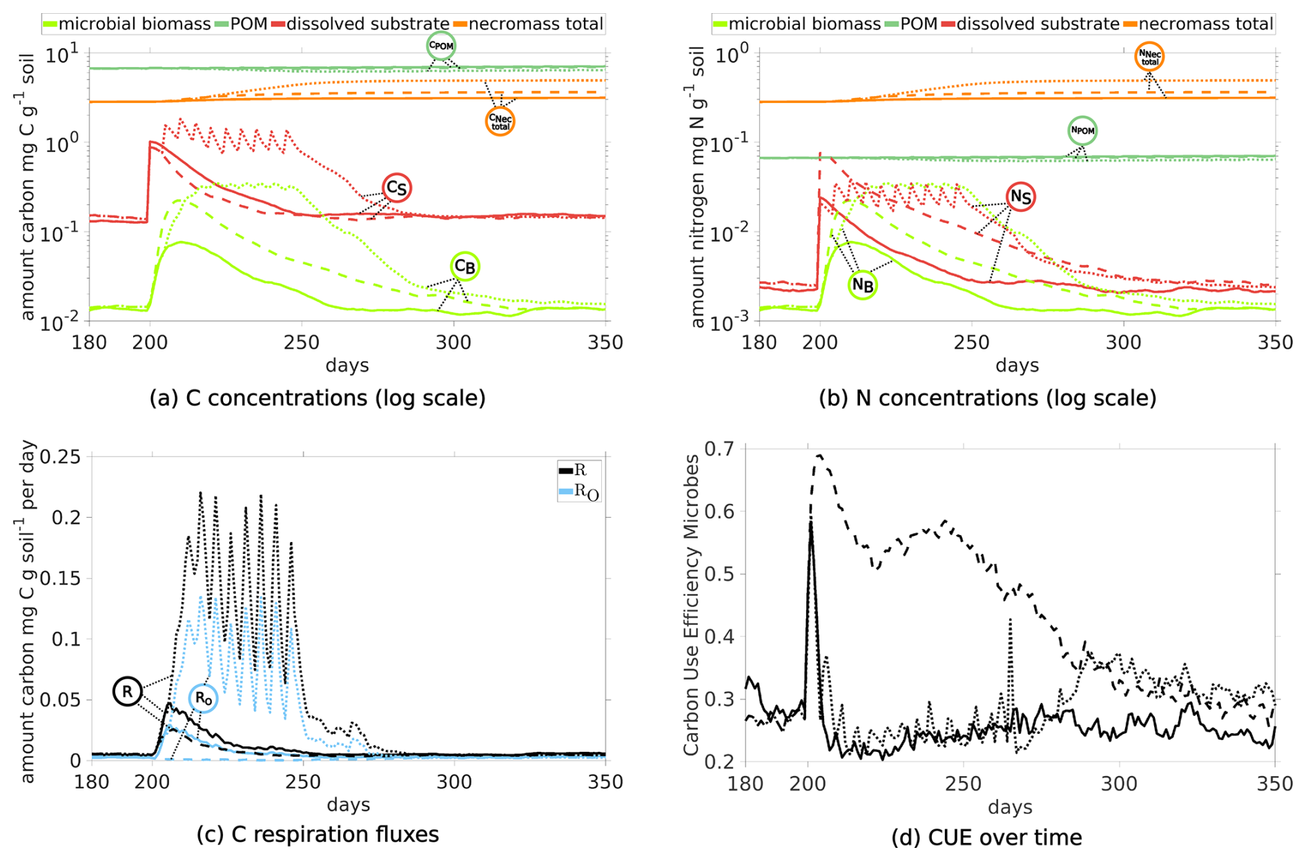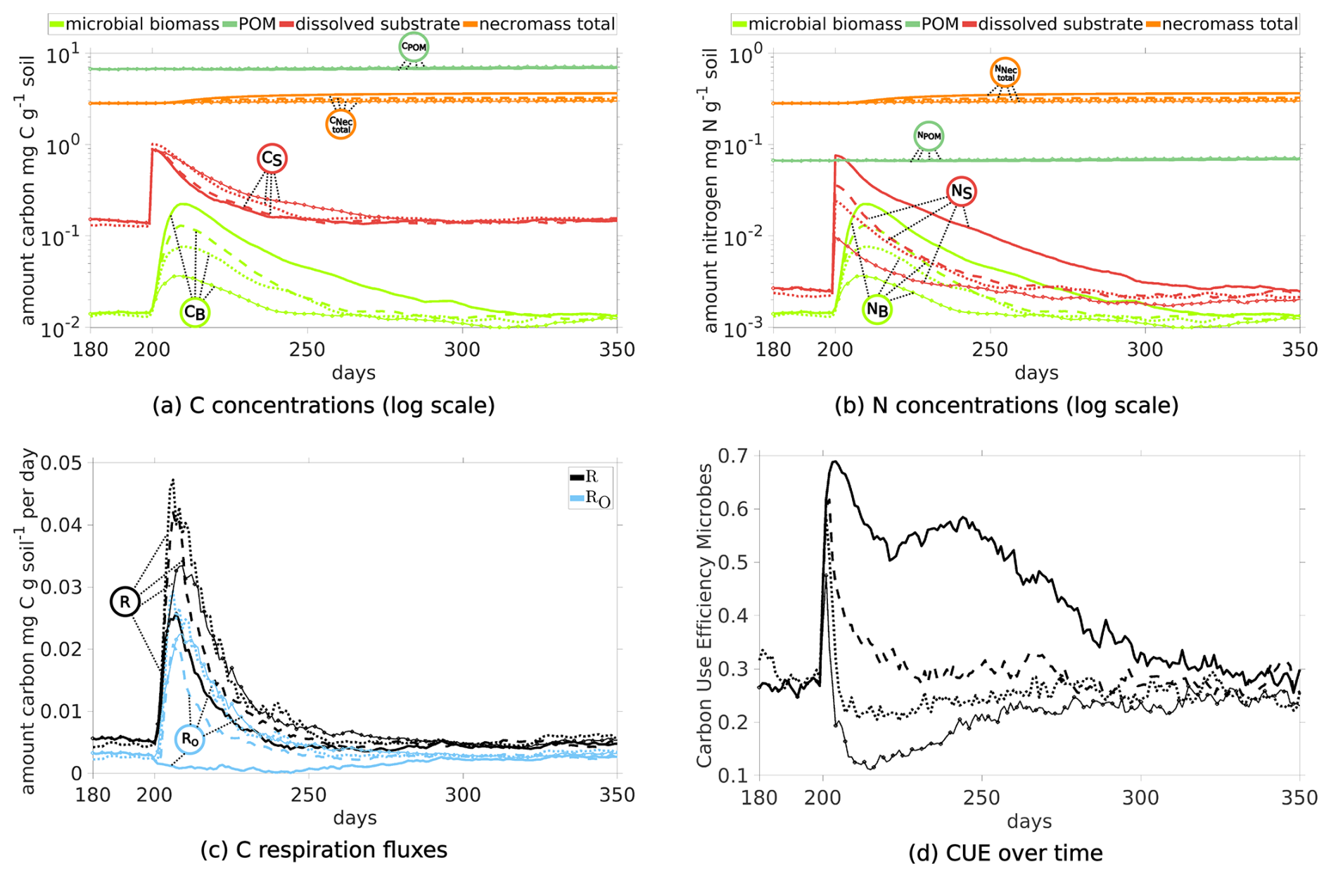 Figure 10Temporal Evolution of C and N concentrations (a, b) and C respiration fluxes (c), and carbon use efficiency (d) for sub-scenarios comparing the impact of the quality of exudates: One pulse at day 200 with ratios 10 (straight lines), 22 (dashed), 40 (dotted; Scen. DynamicReference) and 100 (straight lines with circles).
