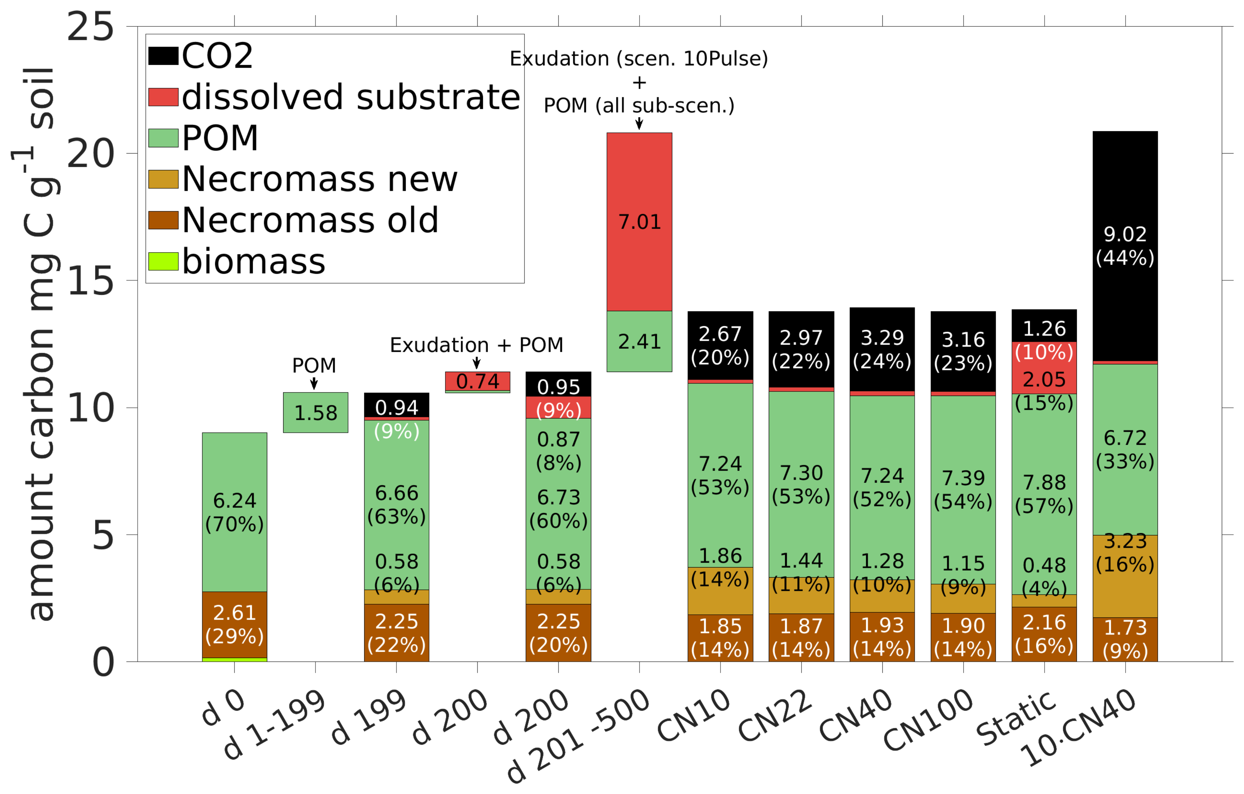 Figure 11Total amount of C and distribution among the pools at time steps 0, 199, 200 (exudate pulse) and 500 is compared for different exudate qualities ( ) in Scenario CN and for the 10pulse-Scenario 10Pulses ( 40) (last bar). Additionally the amounts of C entering the system are displayed (POM and exudates) for the period 1–199 (POM, all scenarios), day 200 (exudates and POM, all scenarios), and days 201–500 (exudation in scenario 10 Pulses, POM for all scenarios). For clarity, the values of pools contributing less than 2 % (biomass and dissolved substrate except in Scenario Static) are not shown.