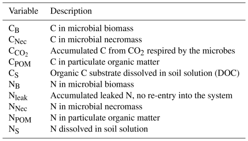 Throughout the simulations the pore space (with pore sizes between 2 and 150 µm) is fully saturated with an initial DOC concentration of C g C cm−3 and an initial ratio of 10. On this small scale, C enters the domain either as fine, partially degraded or fragmented POM particles, or as dissolved C from exudates (see below). The ratio of POM was set to 100, which is in the range of wood or root litter (Poeplau et al., 2023). Initially POM particles with a concentration of 0.48 g C cm−3, and necromass with a concentration of 0.32 g C cm−3 and ratio of 10 amounting to a volume fraction of 5 % of the solid area were randomly added to the pore space corresponding to 60 POM and 60 necromass particles each with a size of 6–10 µm in diameter. Given the small scale of the investigated domain, these particle sizes correspond to a fine fraction of POM (Lavallee et al., 2020). This results in an initial amount of 6.24 mg C g−1 POM-C and 2.61 mg C g−1 microbial-necromass-C. While up to 70 % of the initial soil C is retained in POM, its contribution to the initial soil N content is 20 %. After this initialization 216 microbial biomass voxels with a density of 63.4 mg C cm−3, divided into 72 connected components of 3 cells each are distributed in the pore space. This results in a total amount of microbial biomass of 158 µg C g−1, which corresponds to Niedeggen et al. (2024).