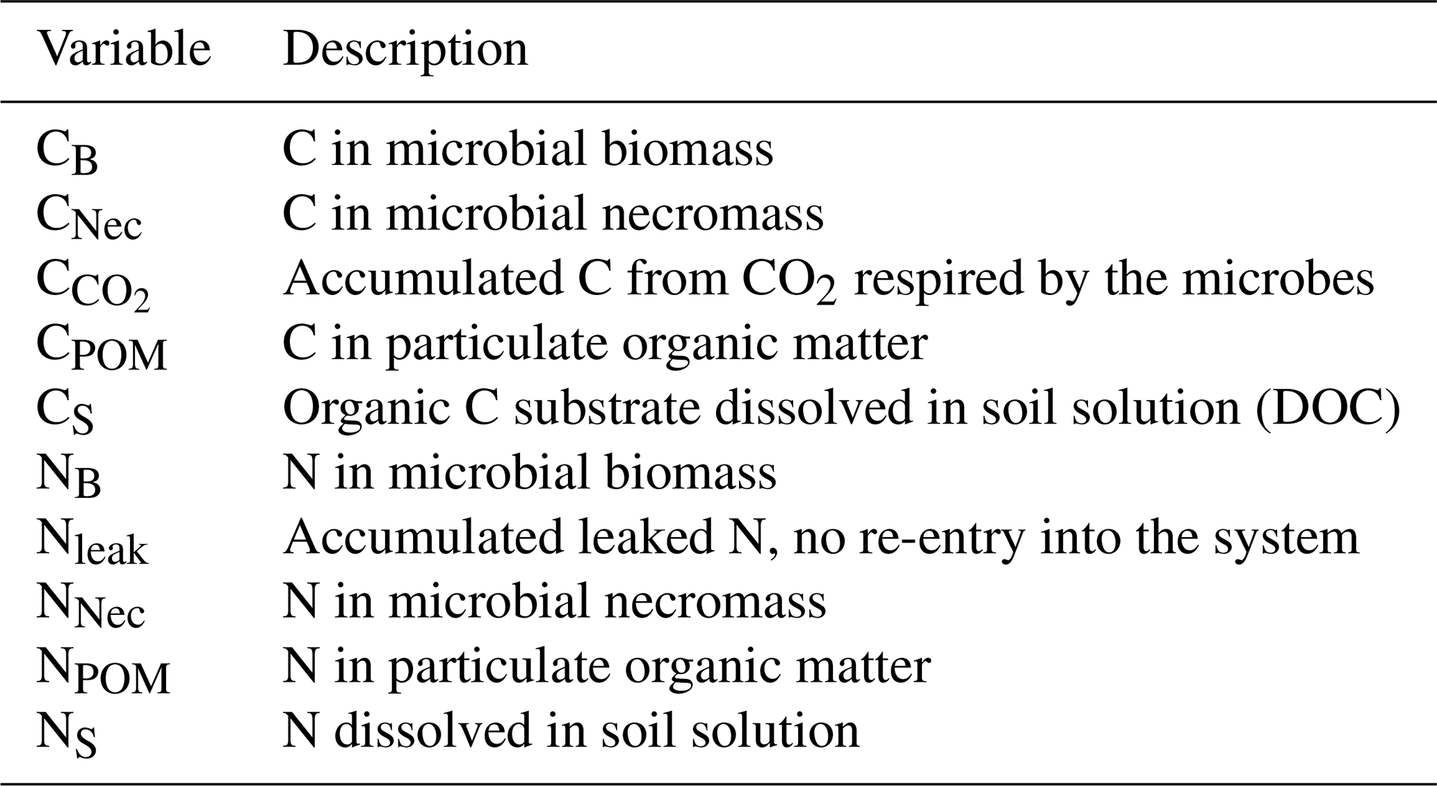 Future work could incorporate the dynamics of phosphorous compounds in a similar manner and thus study their importance for microbial growth in particular for agricultural soils (Kwabiah et al., 2003). Fungal bio/necromass constitutes another important C and N pool in soils (Liang et al., 2019) which can be treated in an analogous way. The effects of environmental factors as temperature or moisture variations are not investigated in this study, but could give rise to further extensions.