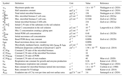 In all scenarios we consider a POM input of 0.083 mg C g−1 by a random placement of one POM particle with 60 µm2 into the pore space of our computational domain every 10th day (compare low input scenario in Zech et al., 2022b). The initial amount of total organic carbon (TOC) in the system constitutes 0.89 % of the soil's mass, which is close to 0.85 % as reported in Vetterlein et al. (2021), and in the range of other loamy soils (cf., e.g., 0.74 %, Endress et al., 2024). The amount of total organic N (TON) is 0.034 % of soils' mass which corresponds to values for crop and grassland soil with low N content; in Vetterlein et al. (2021) 0.083 % is reported. We assume that root exudation takes place along a central vertical line of the computational domain (recall the scheme in Fig. 1). For the root C exudation rate we use the values for maize (wild type) in the plant development stages BBCH14 and 19 reported in Santangeli et al. (2024) and for the Monod kinetics of early season exudates we apply the values reported by Niedeggen et al. (2024), see Table 4. Further, Niedeggen et al. (2024) reported an initial microbial biomass of 158 µg C g−1, a microbial basal activity rbasal of 0.18 µg CO2-C g−1 h−1 and a peak activity rpeak of 2.54 µg CO2-C g−1 h−1. Assuming that basal activity is dominated by metabolic activities not related to growth, the maintenance respiration rate can be derived as the fraction between respiration and microbial biomass 0.3 s−1. Similarly assuming that peak respiration is dominated by growth respiration, which depends linearly on the C uptake, the maximal C uptake rate coefficient of a microbial biomass is derived as 1.6 s−1. Exudation of a passing root causes a C release with a rate of 3.6 µg C h−1 cm−2 (Santangeli et al., 2024) in cells aligned to the vertical center line (if the cell is not of type soil particle). One pulse of constant exudation with this rate through the cell surface of 4 µm2 results in a total rise of DOC of 0.01 mg C g soil−1 per day, which is the duration of one pulse in the reference setting.