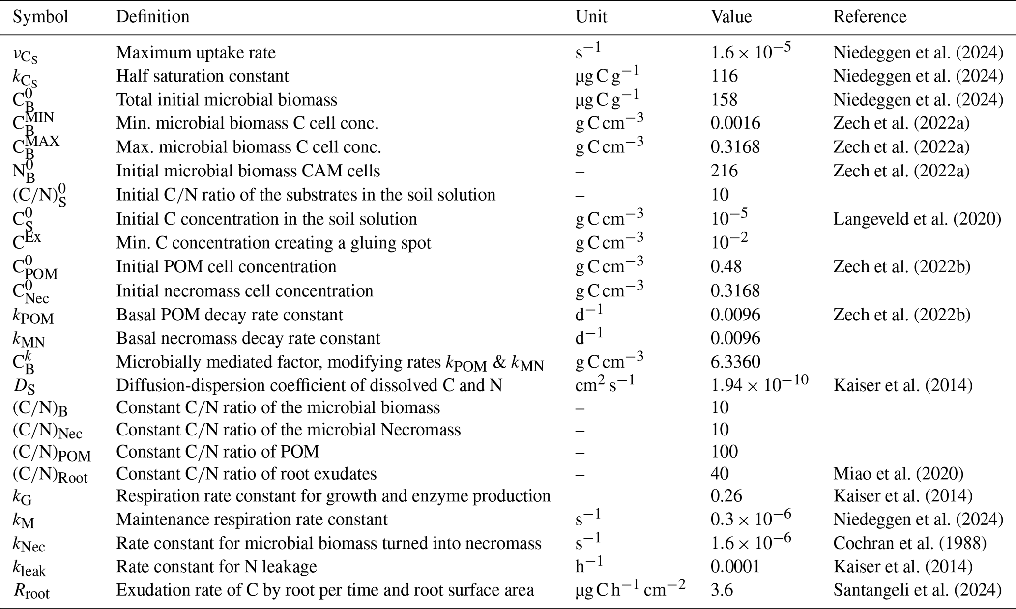 Zech, S., Ritschel, T., Ray, N., Totsche, K. U., and Prechtel, A.: How water connectivity and substrate supply shape the turnover of organic matter – Insights from simulations at the scale of microaggregates, Geoderma, 405, 115394, https://doi.org/10.1016/j.geoderma.2021.115394, 2022a. a, b, c, d