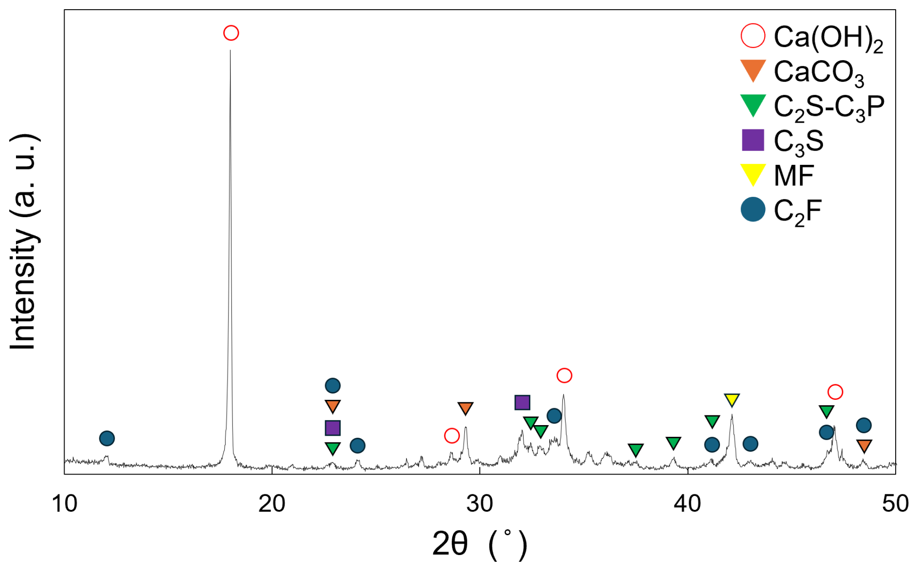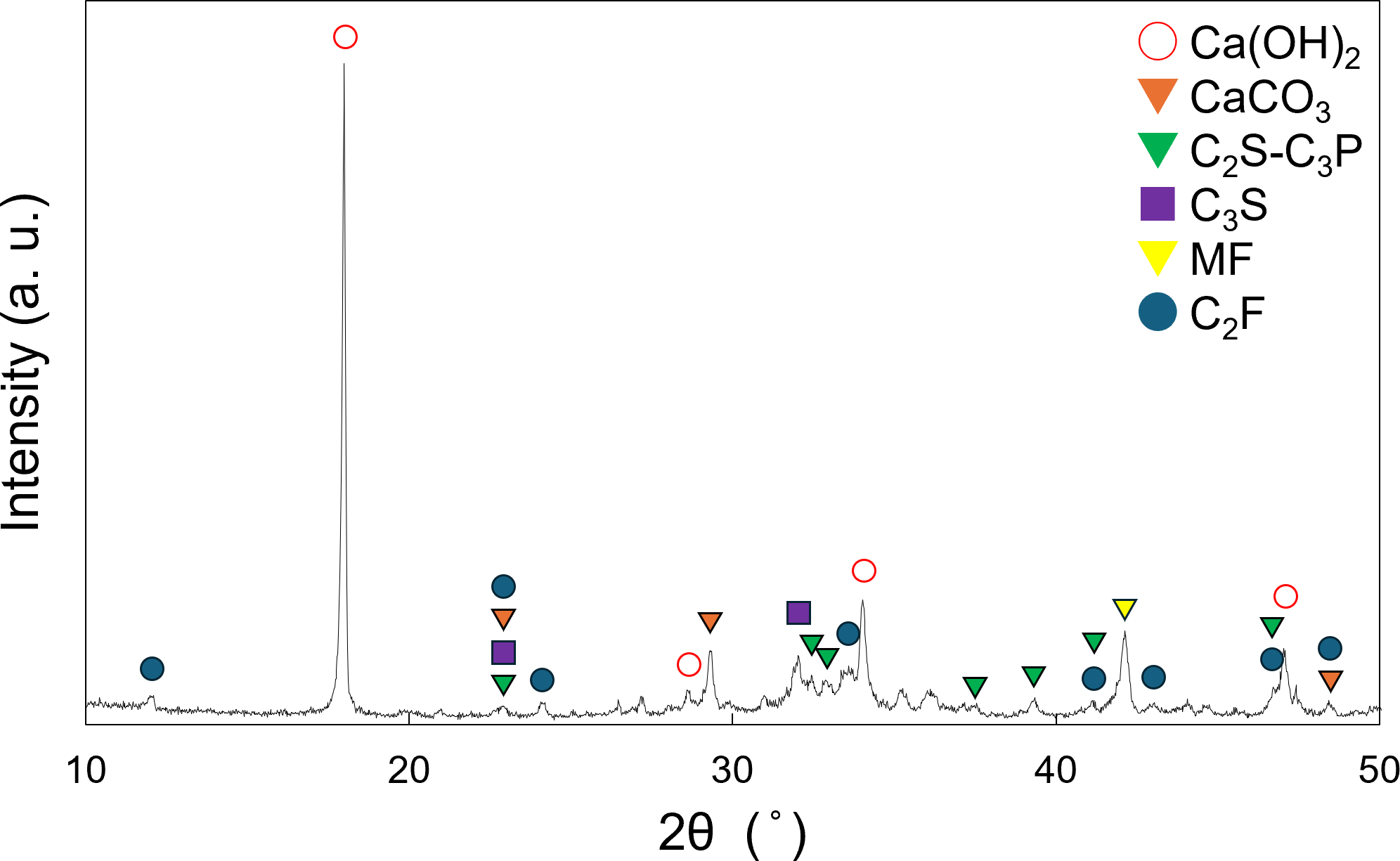 The X-ray diffraction (XRD) pattern of the slag fertilizer is shown in Fig. 1. Diffraction peaks corresponding to calcium hydroxide (Ca(OH)2), calcium carbonate (CaCO3), dicalcium silicate (2 CaO ⋅ SiO2; C2S), tricalcium silicate (3 CaO ⋅ SiO2; C3S), magnesiowüstite (MgO–FeO solid solution; MF), and dicalcium ferrite (2 CaO ⋅ Fe2O3; C2F) were identified, indicating that the slag fertilizer consists of multiple mineral phases. These mineral phases are commonly found in typical steelmaking slag (Gao et al., 2015; Gu et al., 2025; Li et al., 2024; Matsui, 2020), and the slag fertilizer used in this study is not a specialized product, but one derived from general blast furnace–basic oxygen furnace (BF–BOF) process slag.