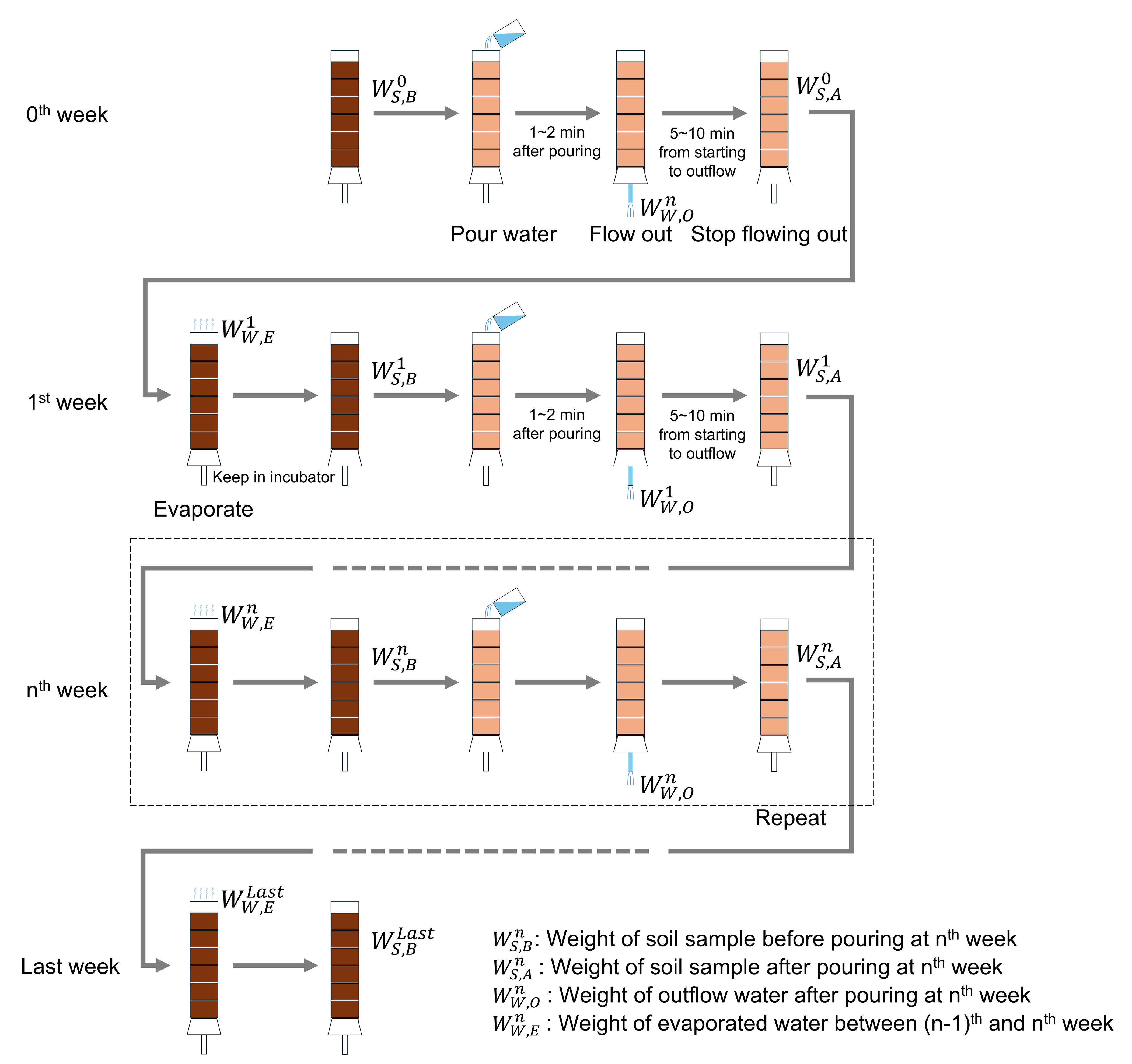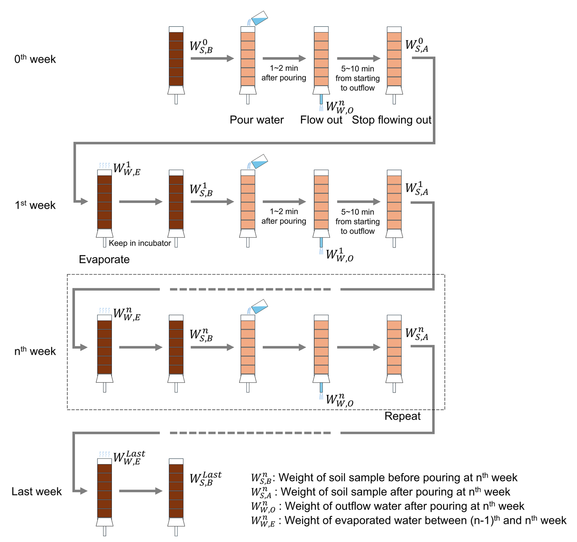 The experimental procedure is illustrated in Fig. 3. Experimental columns packed with the samples were prepared independently for each holding period (1, 2, 4, 8, 12, and 24 weeks), with one column per period (six columns in total). In addition, for each holding period, one column was prepared for the treatment (slag fertilizer application) and one for the control, resulting in a total of 12 columns. Thus, the same columns were not monitored over time; instead, columns were collected at the endpoint of each holding period and evaluated. Each soil column containing a test sample was fixed inside an incubator maintained at 25 °C. A plastic container was placed below the vinyl hose at the bottom of the column to collect leachate. Then, 70 mL of distilled water was gently poured into the top of the column. The volume of distilled water was determined by dividing the average annual precipitation in Japan (Ministry of Land, Infrastructure, Transport and Tourism, 2006) by the number of weeks in a year. After water infiltration was complete and leachate flow from the bottom ceased, a syringe equipped with a cartridge filter (pore size: 0.2 µm) was used to collect the leachate sample. The column was then kept inside the incubator for seven days. This cycle of water addition, leachate sampling, and incubation was repeated weekly for designated durations of 1, 2, 4, 8, 12, or 24 weeks. No water was added during the final week of each experiment. To determine the water content of the soil and soil–slag mixture samples within the columns, the total weight of each column and the amount of leachate collected were measured using an electronic balance before and after water addition. After completion of the leaching tests, the columns were disassembled. The soil and soil–slag mixture layers, separated by plastic mesh, were collected layer by layer and air-dried in an incubator maintained at 40 °C for at least three days. The resin-embedded slag fertilizer samples were cleaned using an ultrasonic cleaner to remove any adhering soil and prepared for surface and cross-sectional observations.