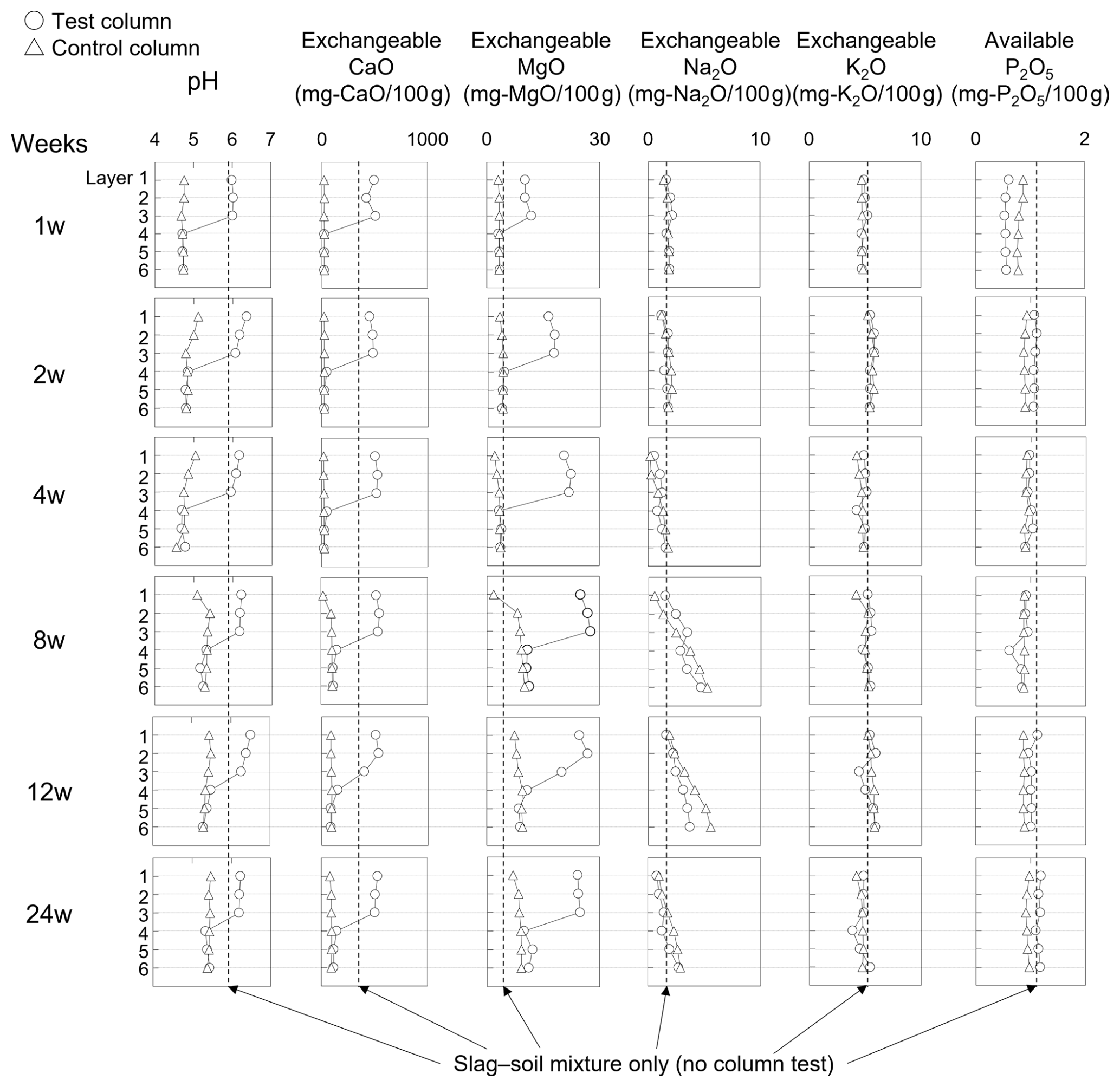 Exchangeable CaO and MgO levels were higher in the slag-mixed layers of the test columns and were similarly maintained at elevated levels for 24 weeks.
