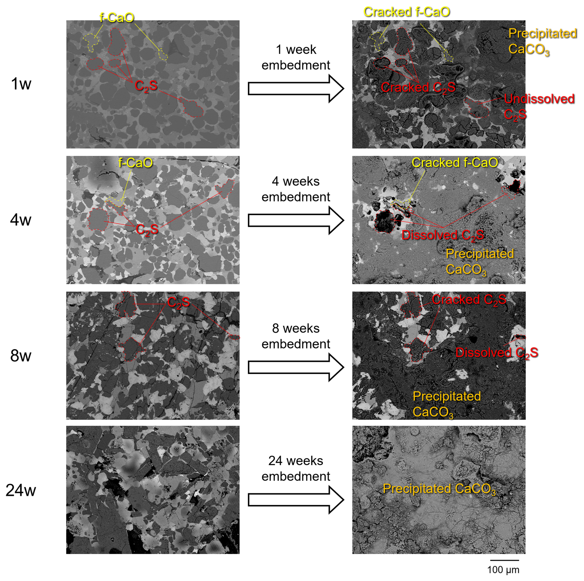 The cracking observed in the f-CaO and C2S phases in this experiment is considered to be caused by their dissolution upon contact with water during infiltration, and by the volumetric expansion resulting from the formation of Ca(OH)2 through the reaction of the f-CaO phase with water (Wang et al., 2010).