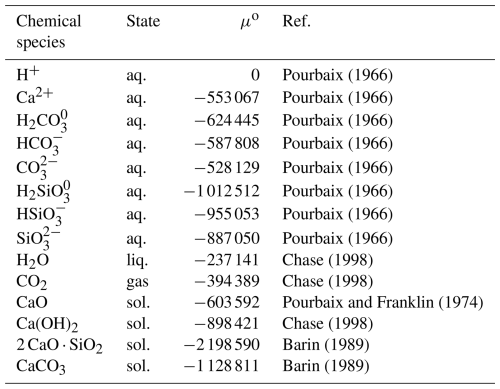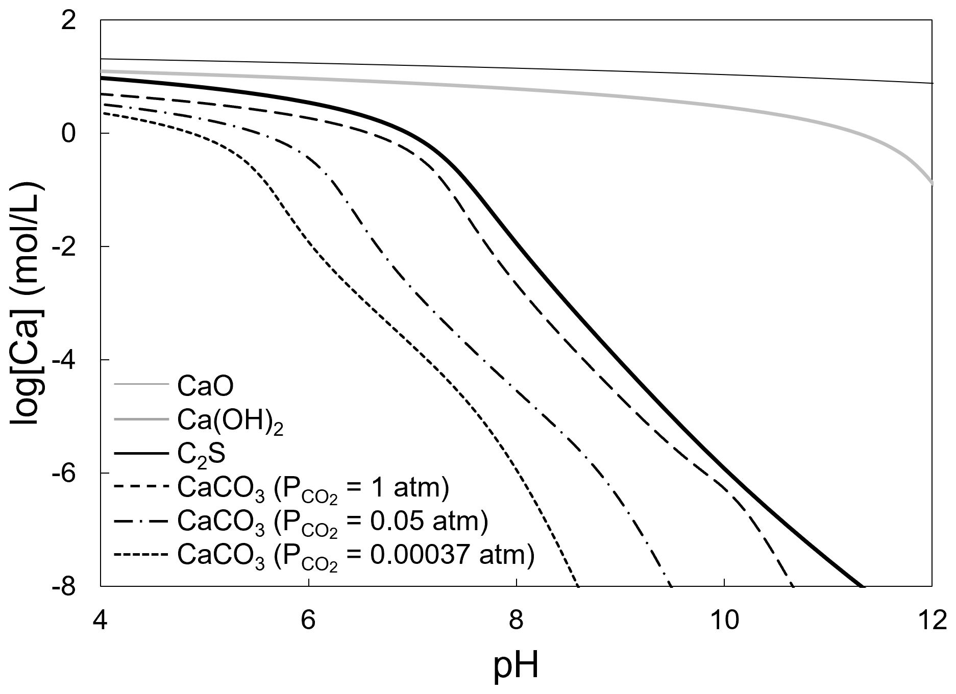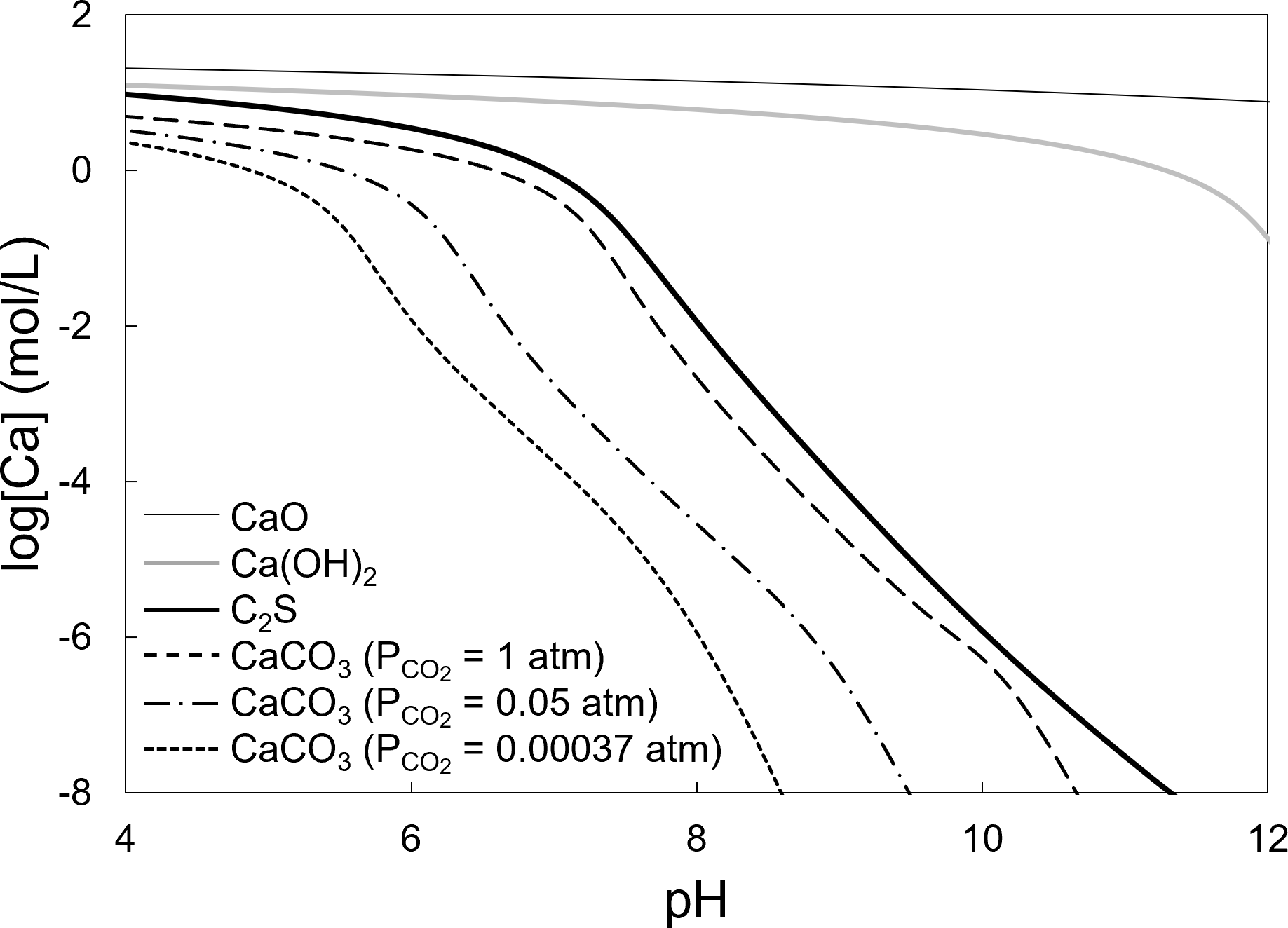 Figure 8 presents pH–solubility curves for the CaO, Ca(OH)2, CaCO3, and C2S phases. In these calculations, the dissolution reactions of carbon dioxide (Eqs. 5 to 7) and the dissociation reactions of the carbonate and metasilicate species (Eqs. 8 and 9) were considered (Futatsuka et al., 2004). It was assumed that the CaO, Ca(OH)2, and C2S phases dissolved while maintaining the anion-to-cation ratios as defined by their chemical composition. For CaCO3, solubility was calculated under various CO2 partial pressures. The equilibrium constants for each reaction were calculated from the chemical potentials listed in Table 3 (Barin, 1989; Chase, 1998; Futatsuka et al., 2004; Pourbaix, 1966; Pourbaix and Franklin, 1974) using the Van't Hoff isotherm.