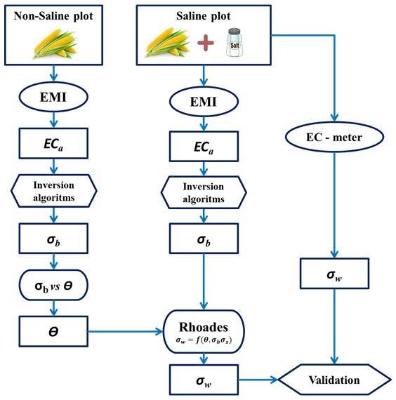 Electromagnetic induction (EMI) offers a fast, non-invasive, in situ geophysical method to map spatial variability in soil. EMI instruments measure the apparent soil electrical conductivity (ECa), which reflects the integrated contribution of the bulk electrical conductivity (σb) of different soil layers. By inverting the measured ECa, it is possible to obtain the distribution of the σb along the soil profile, which provides indirect information on soil salinity. However, in saline soils, σb is influenced by both water content (θ) and soil solution electrical conductivity (σw) (the salinity), making it difficult to independently quantify these two variables through a single, straightforward procedure.