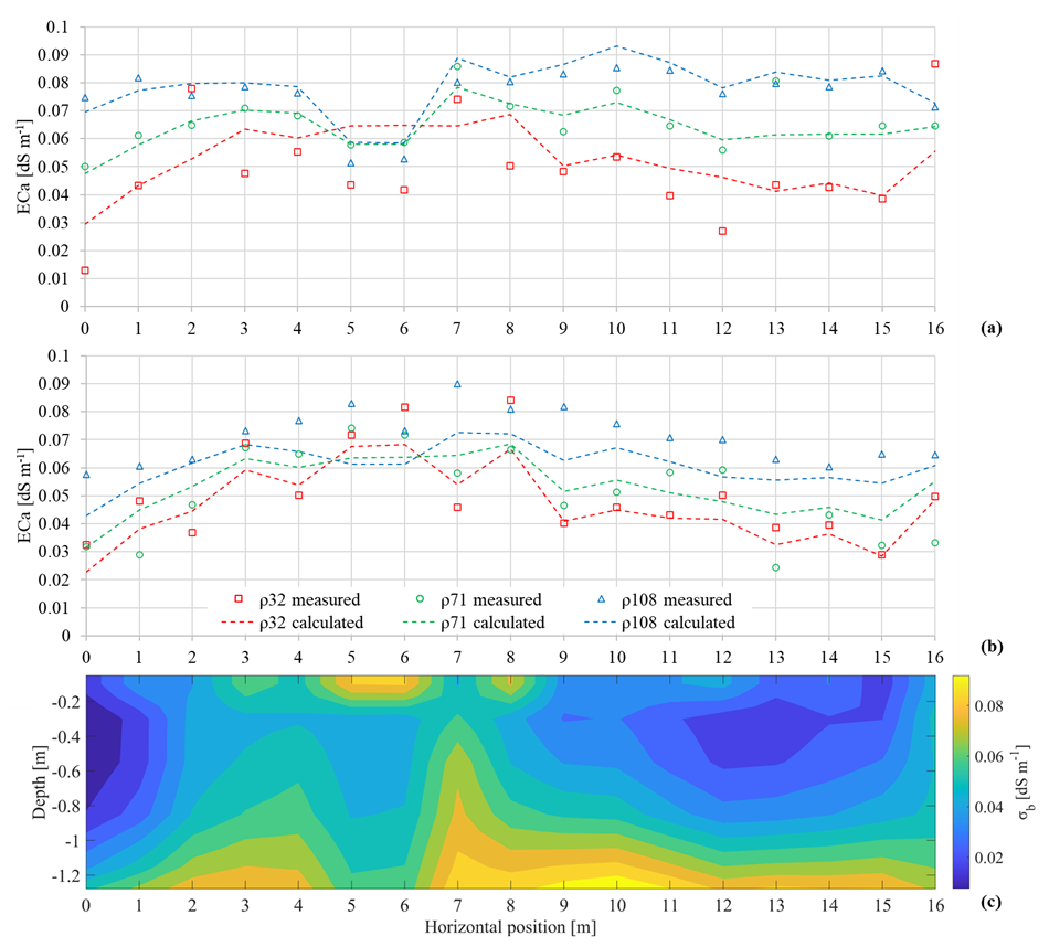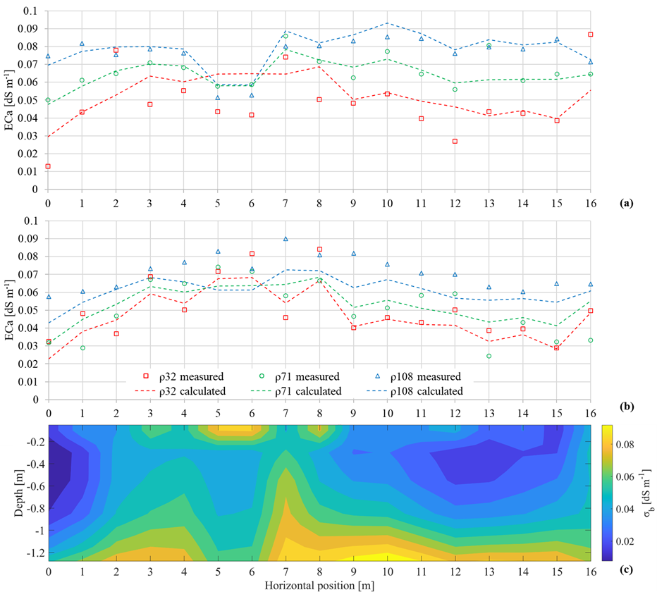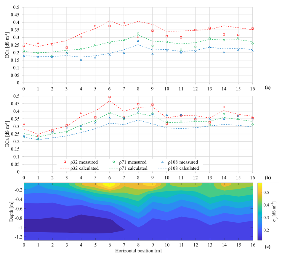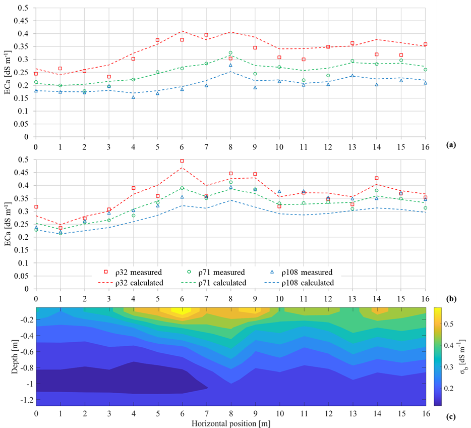 Figure 3Apparent soil electrical conductivity (ECa) along the transect for the non-saline plot: (a) HCP mode; (b) VCP mode. Points indicate measured ECa, while dashed lines show the calculated ECa (forward response of the inversion). (c) Inversion results showing the bulk electrical conductivity (σb) distribution with depth.