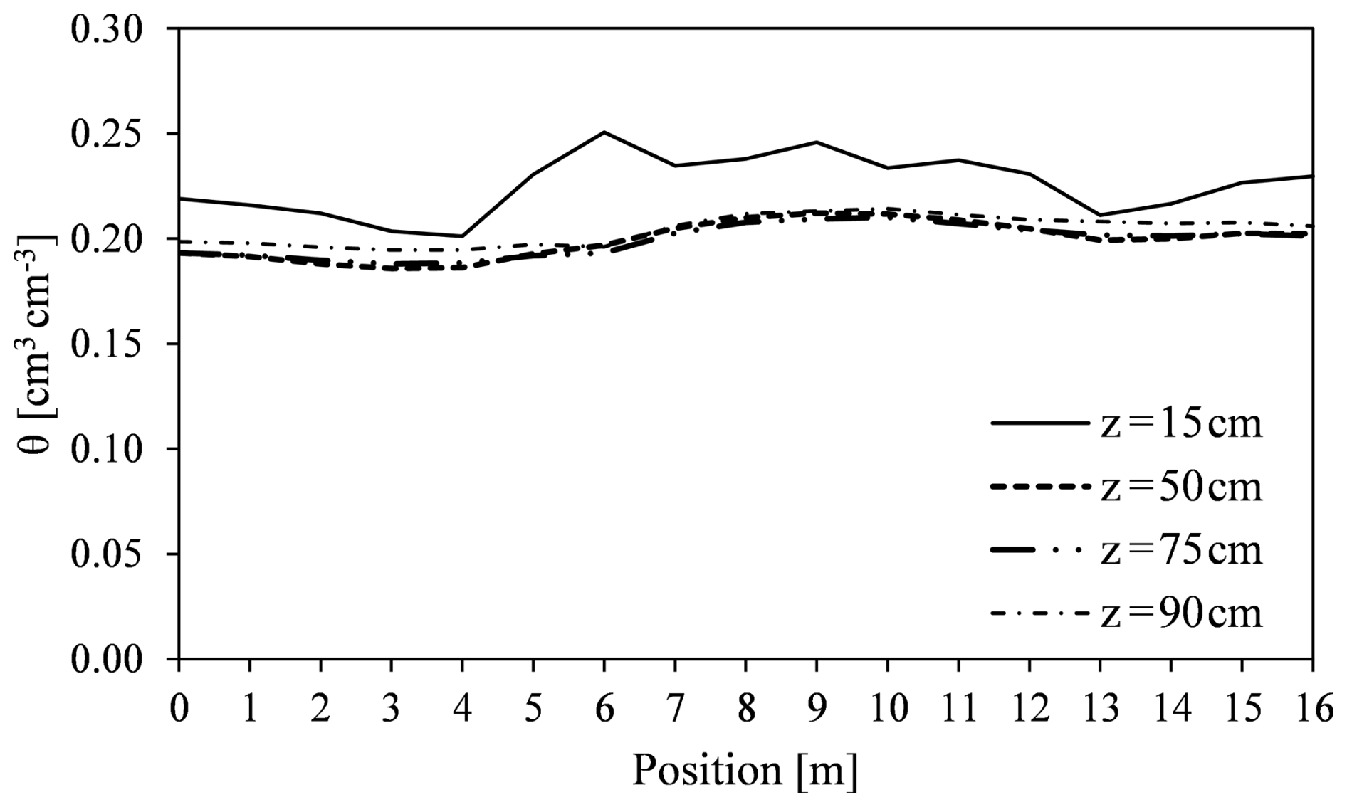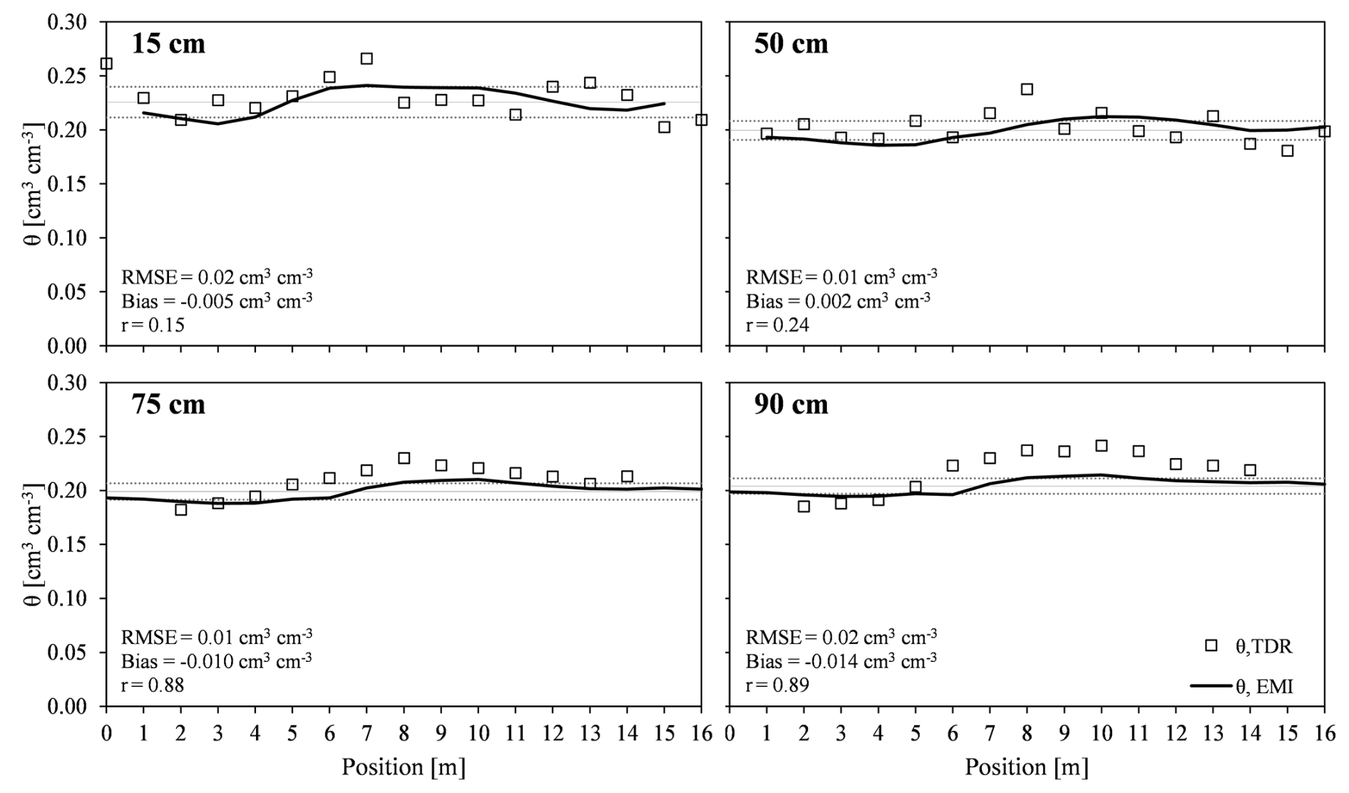 Figure 10Spatial distribution of soil water content within the trench for four depths (15, 50, 75 and 90 cm) as measured by TDR (θTDR) and estimated by EMI, (θEMI) in the non-saline transect. The θTDR data are represented by empty square. θEMI data for each position are represented by a continuous thick solid line. Horizon-wise mean of θEMI value is represented by a thin solid line while dashed lines represents the horizon-wise θEMI mean ± SD.