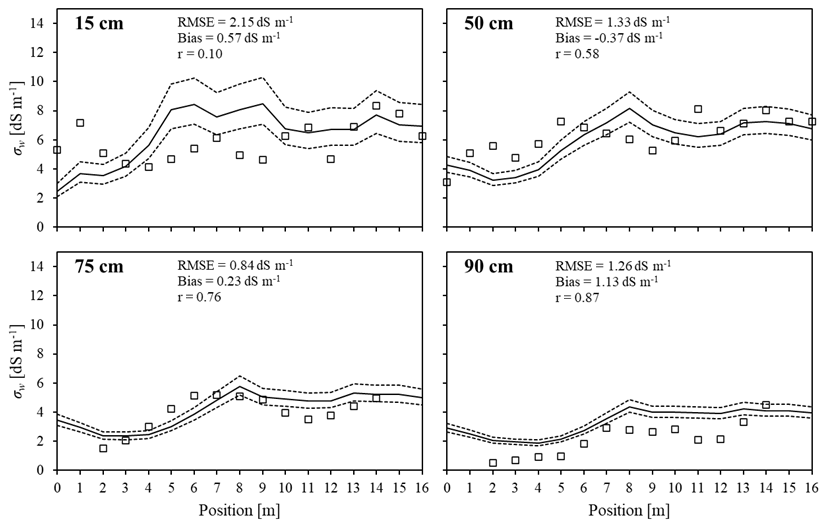 Regarding correlation and RMSE, the impact of soil water content variability on the σw estimate decreases with increasing measurement depth. At 15 cm the effect is relatively pronounced, whereas at greater depths it becomes negligible. This finding underscores the robustness of the obtained values, with minimal uncertainty at deeper layers. However, at 15 cm the estimates are less reliable. In fact, various studies have highlighted the impact of θ variability on soil salinity estimation, particularly within the root zone, where significant fluctuations in θ occur due to irrigation practices and evaporation (e.g., Gómez Flores et al., 2022; Paz et al., 2020).