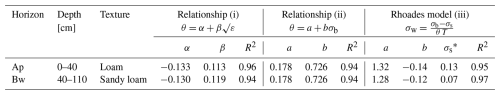 Table 1Coefficients and R2 values for the θ–√ε, θ–σb, and θ–σb–σw soil-specific calibration relationships